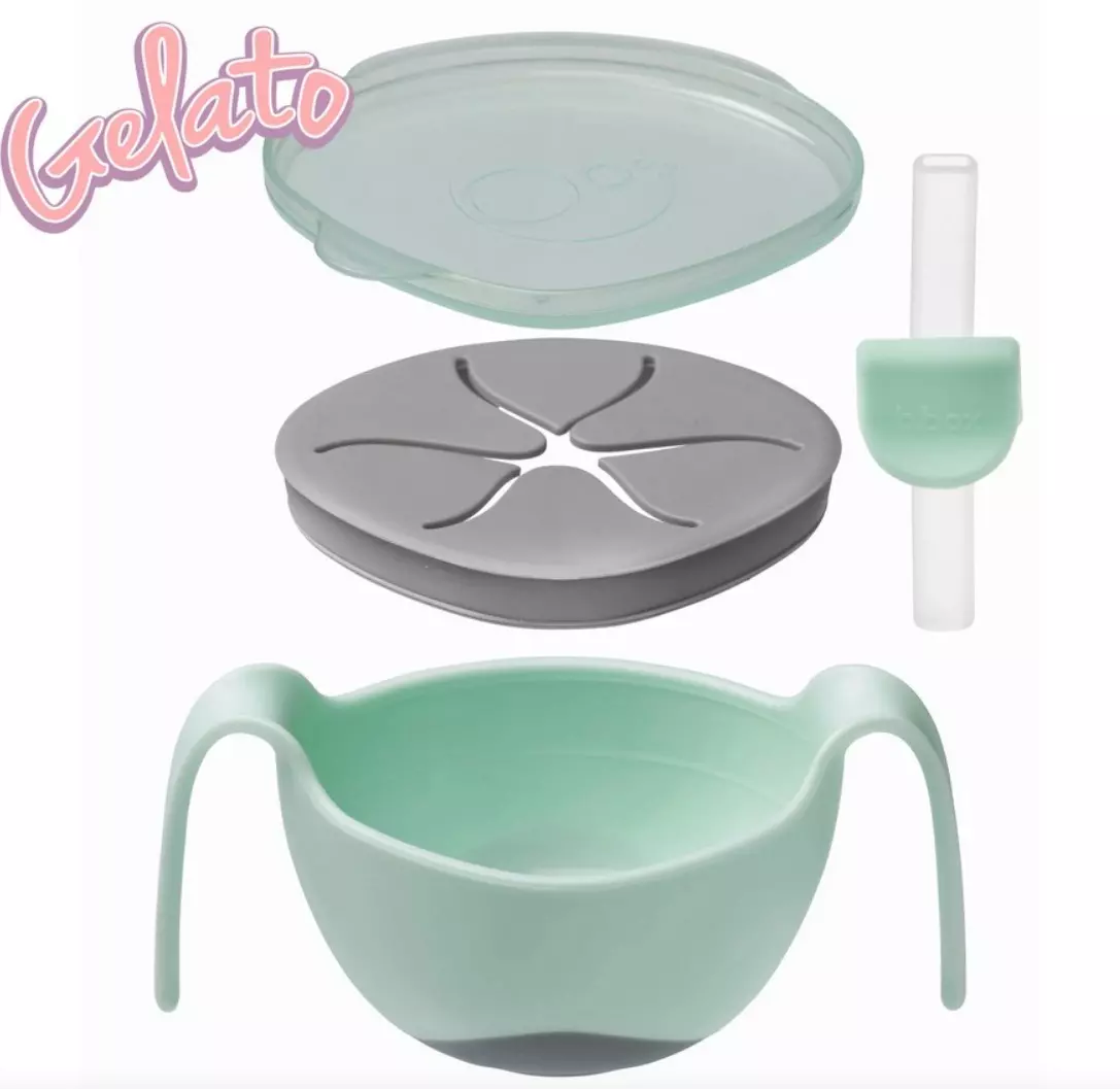 B.Box Bowl&Straw on monipuolinen eväskulho, jossa on pilli, napostelukansi, sekä suojakansi. Kulhossa on kahvat, joista lapsi saa tukevan otteen. Irroitettavan silikonipillin avulla lapsi voi esimerkiksi muroja syödessä juoda jäljelle jäävän maidon. Kulho toimii myös kätevänä napostelupurkkina esim. matkoilla erillisen kannen kanssa.