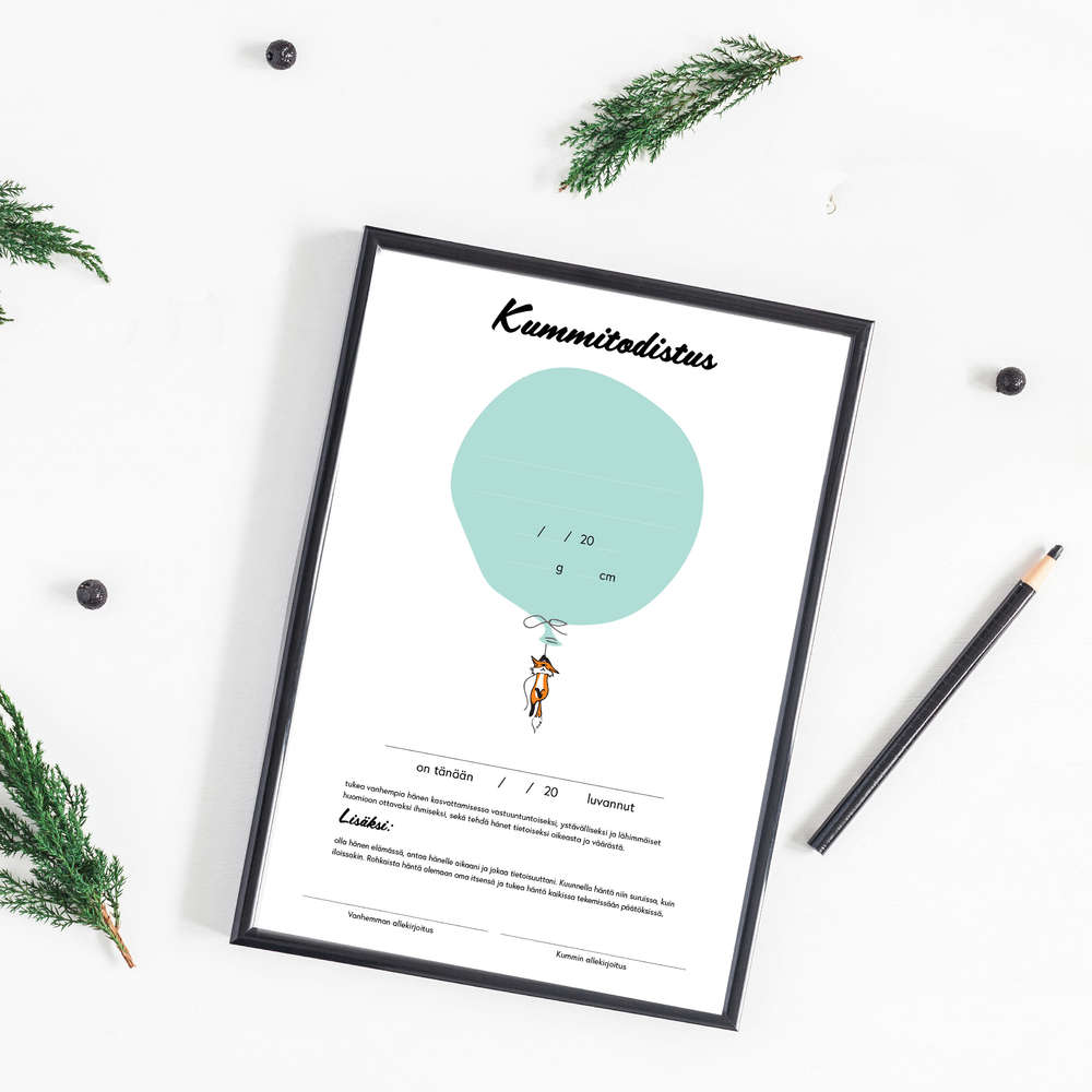KirpunKoti kummitodistus minttu kettu on kaunis ja valmis pohja, johon täydennetään lapsen ja kummin tiedot osaksi valmista tekstiä. Koko: 20 x 30 cm