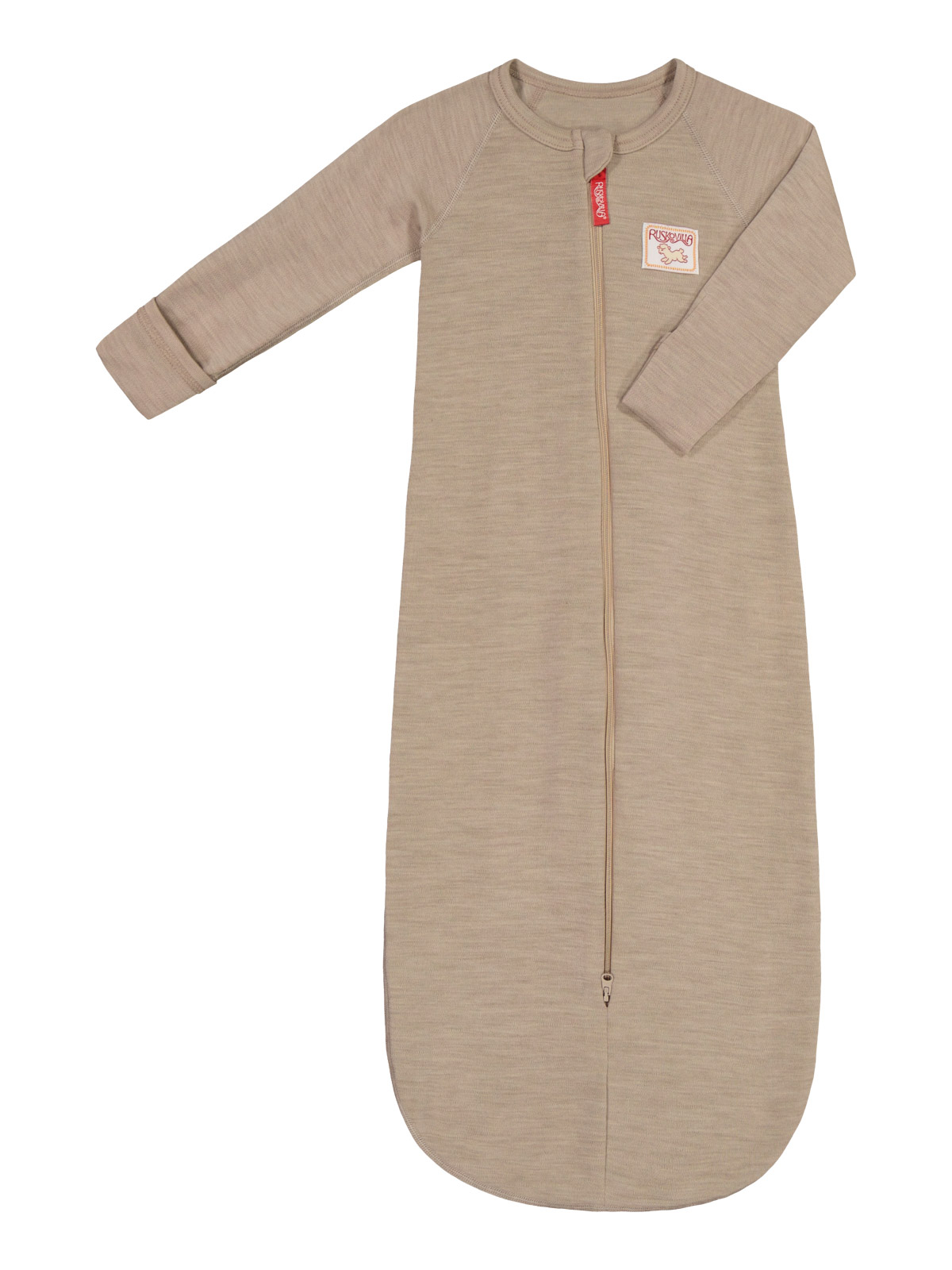 Ruskovilla unipussi hihoilla on 100 % luomumerinovillaa. Hihallisessa unipussissa on pitkä kaksisuuntainen vetoketju sekä hihat, joissa on sormien-yli-käänteet (huom, ei koossa 90cm). Vetoketjun päässä leuan alla on kangas, jotta vetoketju ei hankaa ikävästi leukaan.