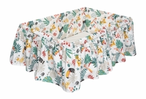 Äitiyspakkauksen reunapehmuste Anne & Mikael on tropiikki-kuvioinen pehmuste. Reunapehmuste sopii kokonsa puolesta äitiyspakkaukseen ja pehmustaa kovat reunat mukaviksi vauvalle. Reunapehmuste myös somistaa äitiyspakkauksen pahvikuoren, jolloin vauvan ensisänky näyttää erityisen somalta. Konepestävä.
