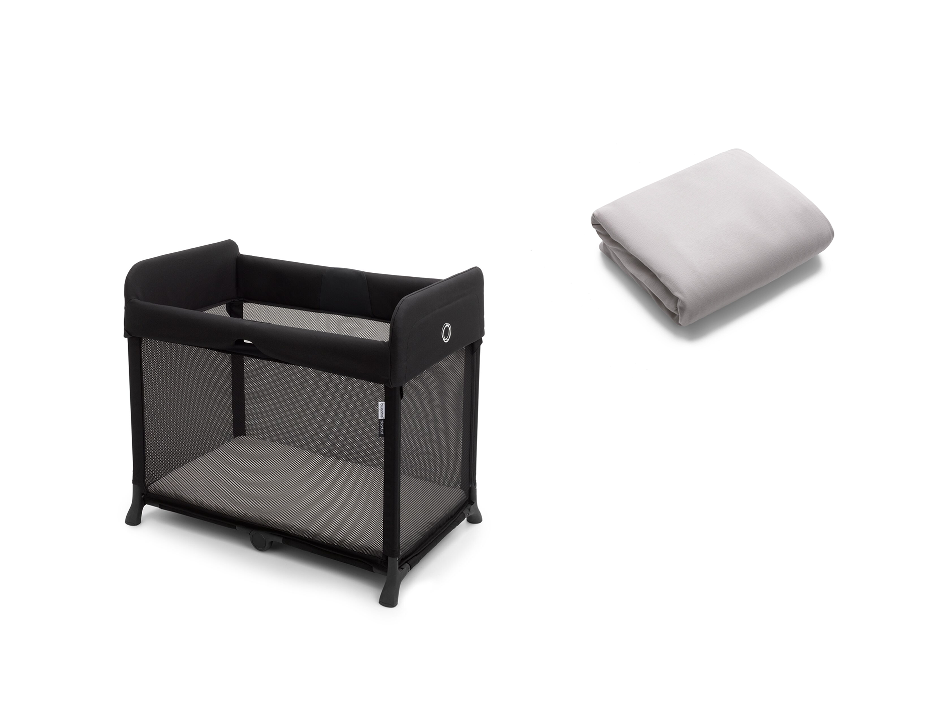 Bugaboo Stardust matkasänky ja lakana sisältää mustan matkasängyn, sekä valkoisen lakanan.