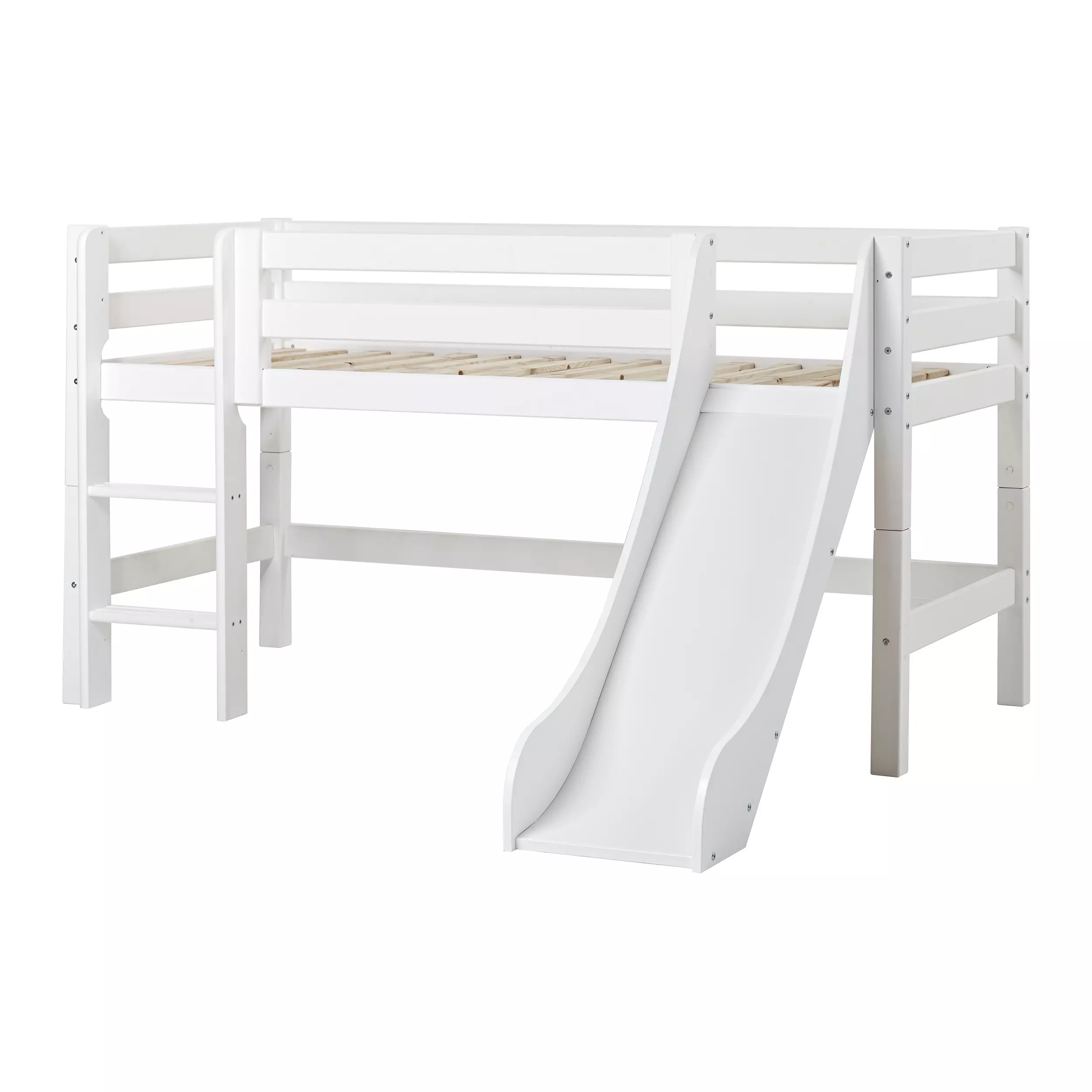 Hoppekids ECO Luxury puolikorkea sänky koossa 70x160 cm. Sängyssä on suorat portaat ja liukumäki joka tekee aamuherätyksistä hauskempia! Puolikorkea sänky vapauttaa hyvin lattiatilaa lastenhuoneessa. Tämä sänky on Joutsenmerkki merkitty, katettu Hoppekidsin elinikäisellä takuulla ja tuotteen pinta on käsitelty vesipohjaisella, luontoystävällisellä lakalla joka ei sisällä haitallisia ainesosia tai turhia kemikaaleja. Voidaan pestä kuivaksi puristetulla liinalla ja miedolla saippuavedellä.