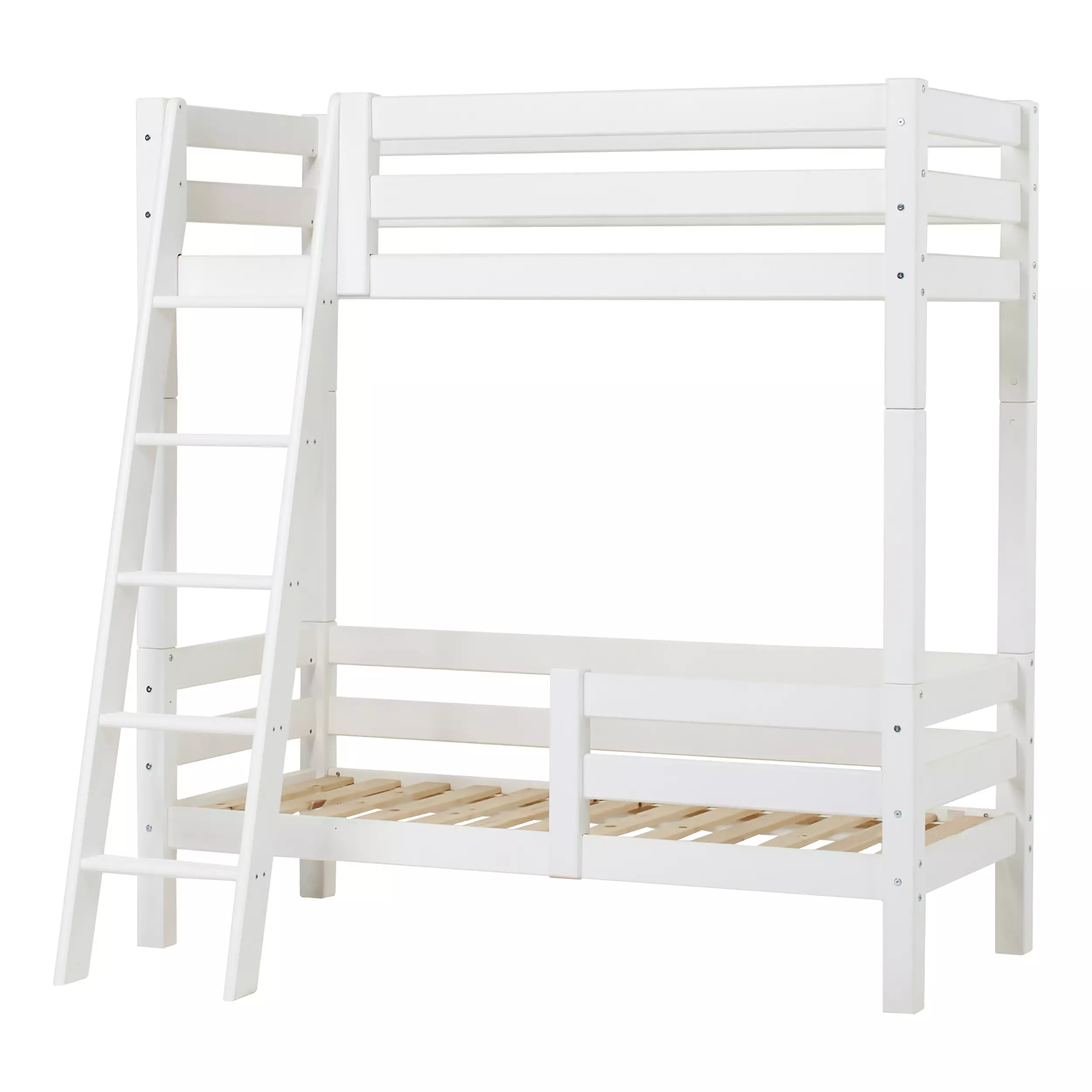 Hoppekids korkea kerrossänky 70x160cm alasängyn takalaidalla, turvakaiteella ja kaltevilla tikkailla - valkoinen