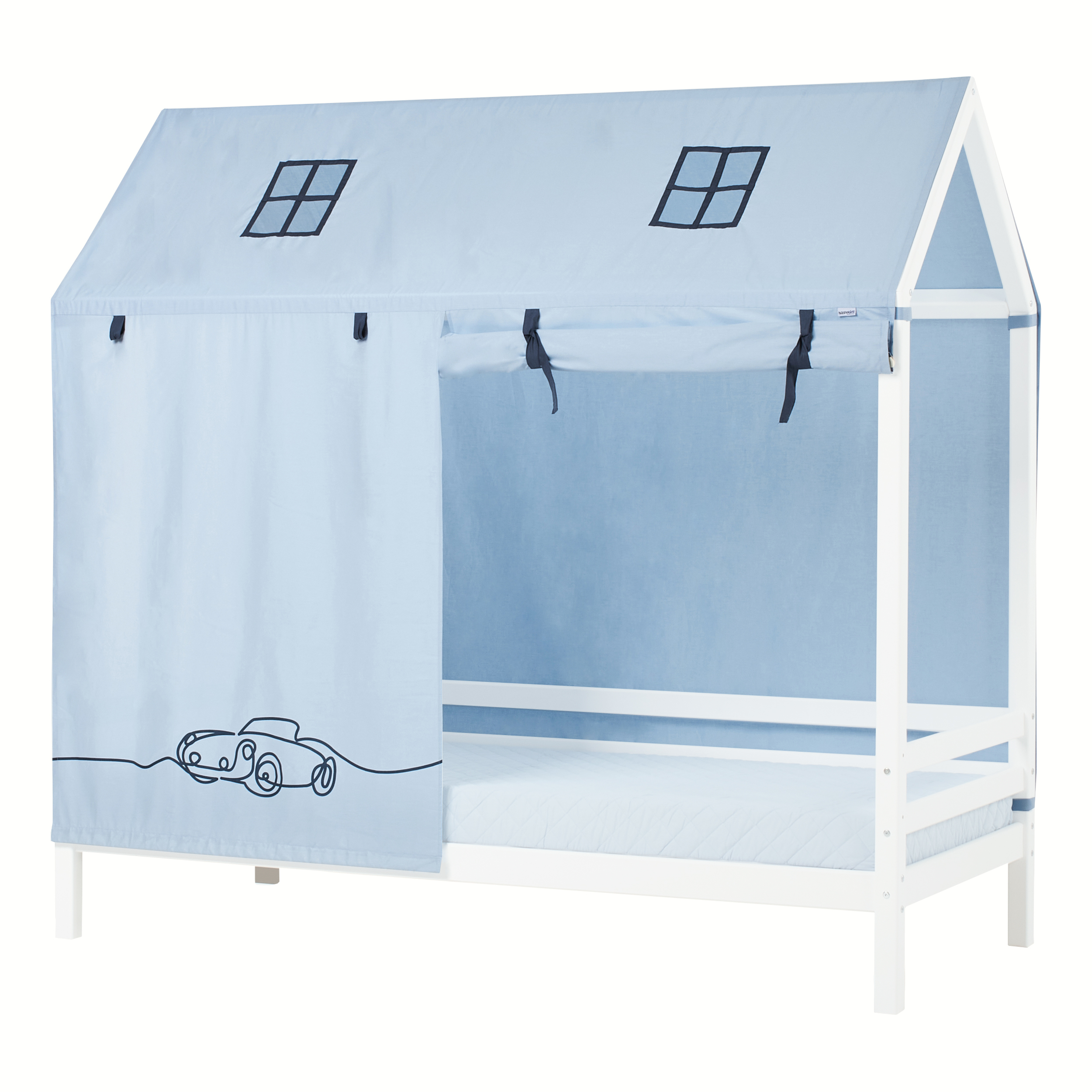 Hoppekids talosängyn kattoverho muovaa ihanan sängyn kotoisaksi koloksi lapsellesi. Tekstiilien avulla saat loihdittua lastenhuoneeseen erilaisia tunnelmia ja lapsesi mielikuvitus saa laukata vapaasti. Verhot on jaettu keskeltä joten voit avata verhot haluamallasi tavalla. Tekstiilit kiinnitetään helposti velcro tarroilla jolloin niiden irrottaminen on nopeata ja vaivatonta. Kattoverhotekstiilejä löytyy useassa eri kuosissa ja jokaiseen kuosiin löytyy myös muita tekstiililisäosia kuten lakanasettejä, tyynyjä ja tunneleita. Anna luovuutesi päästä valloilleen ja luo lapsellesi lastenhuone jossa on ilo leikkiä ja myös nukkua. Voidaan pestä 30 asteessa ja silittää silitysraudan puuvilla-asetuksella. Älä kuivata kuivausrummussa.