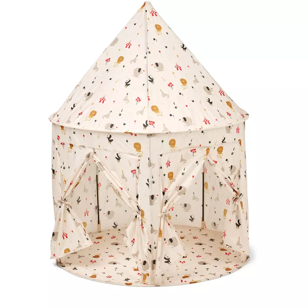 Liewood Oaks pop-up leikkiteltta luo lapselle oman mukavan paikan kotona ja kannustaa mielikuvitukselliseen leikkiin. Leikkiteltta sopii käyttöön niin pienille, kuin jo hieman isommillekin lapsille. Teltan ikkunoita ja sivuja saa avattua eri tavoin ja muokattua niitä erilaisten leikkien mukaan. Teltan beigessä pohjakankaassa on hauskoja sirkusaiheisia hahmoja ja kuvioita. Teltan mukana tulee säilytyspussi sekä kasaukseen tarvittavat osat. Teltta on nopea kasata takaisin säilytyspussiinsa ja se on helppo säilyttää.