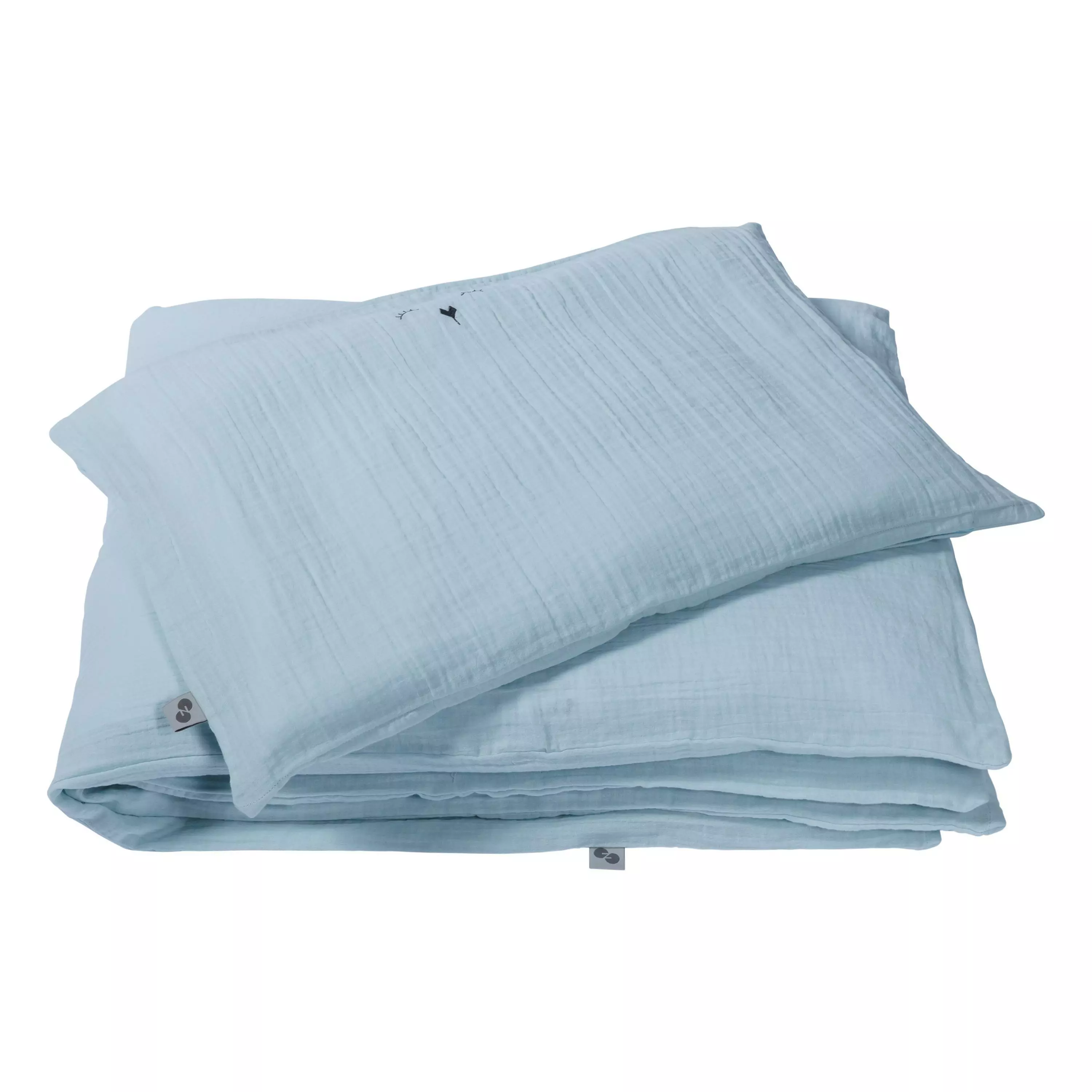 NordBaby pussilakanasetti 100 x 130 cm sisältää tyynyliinan ja pussilakanan kauniin mintun värisenä. Lakanasetti on 100% musliinipuuvillaa, joka pitää lapsen viileänä kesällä ja lämpimänä talvella. Lakanat on pakattu pieneen kangaskassiin, jota voi käyttää säilytyksen lisäksi moneen eri tarkoitukseen.