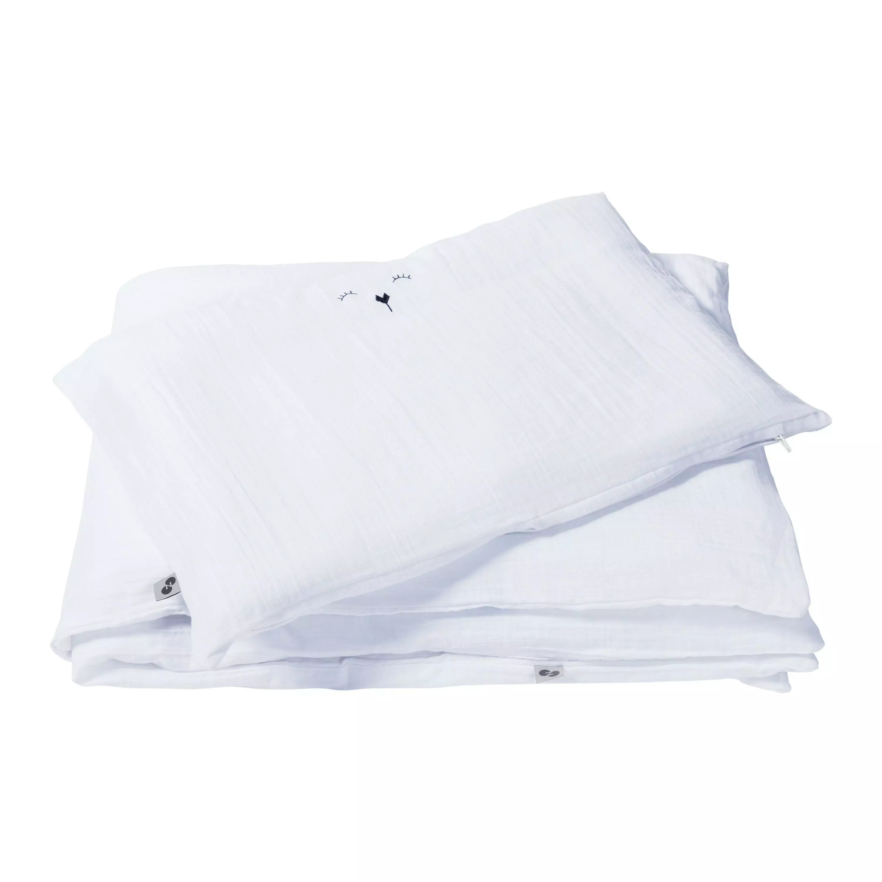 NordBaby pussilakanasetti 100 x 130 cm sisältää tyynyliinan ja pussilakanan kauniin valkoisena. Lakanasetti on 100% musliinipuuvillaa, joka pitää lapsen viileänä kesällä ja lämpimänä talvella. Lakanat on pakattu pieneen kangaskassiin, jota voi käyttää säilytyksen lisäksi moneen eri tarkoitukseen.
