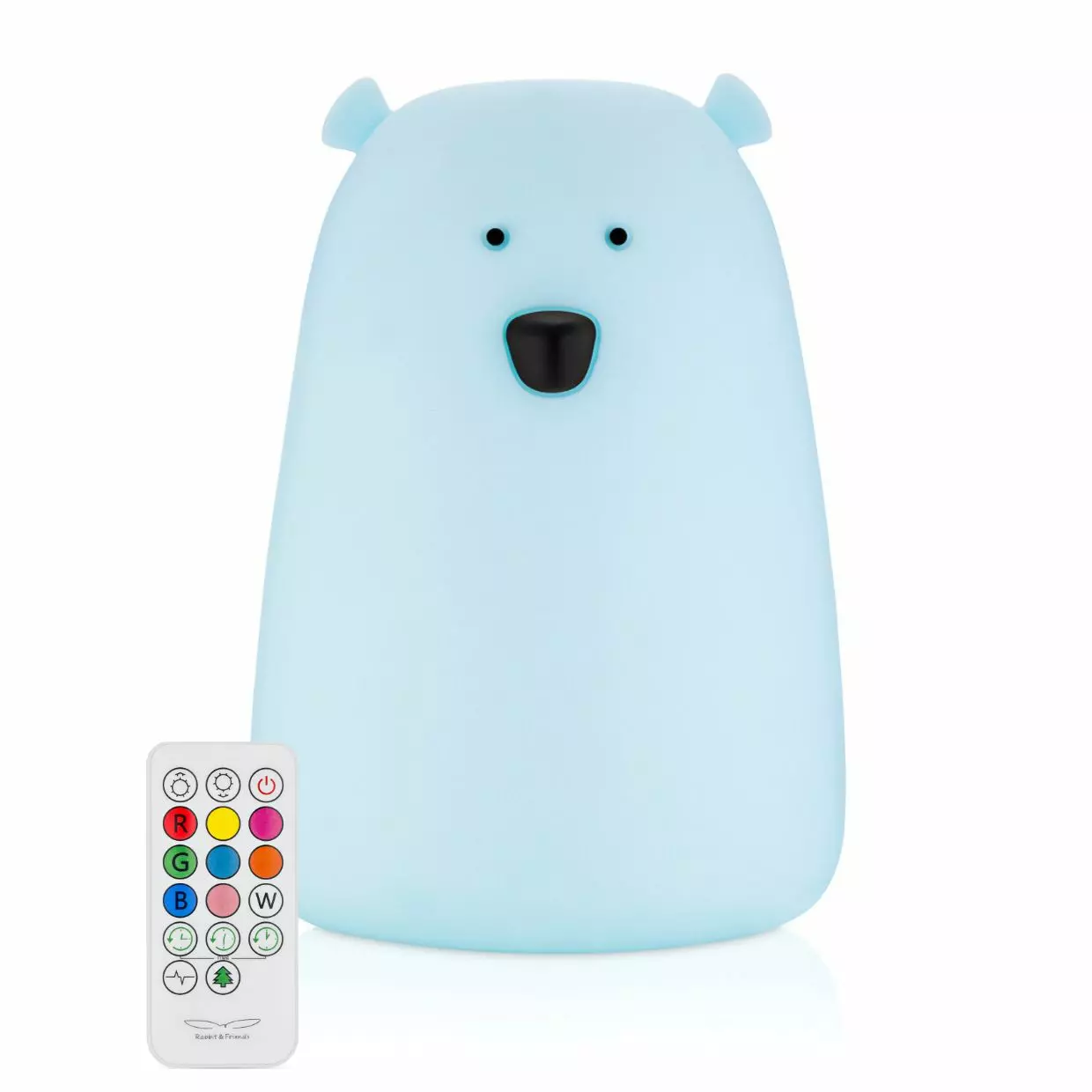 Rabbit & Friends yövalo Bear on ladattava yövalo, jota voidaan ohjata kaukosäätimellä. Lämpimästi valaiseva yövalo voidaan laittaa esimerkiksi lapsen yöpöydälle tai koristeeksi pöydälle, tai antamaan himmeää valoa vaipanvaihdossa yöaikaan. Valittavissa on seitsemän eri väriä, joita saa vaihdettua kätevästi kaukosäätimellä. Se on valmistettu pehmeästä silikonista eikä se kuumene käytössä. Yövalo valaisee jopa 12 tunnin ajan täyteen ladattuna. Yövalo toimii napauttamalla, ja siinä on automaattinen sammutusmahdollisuus kahden tunnin kuluttua.