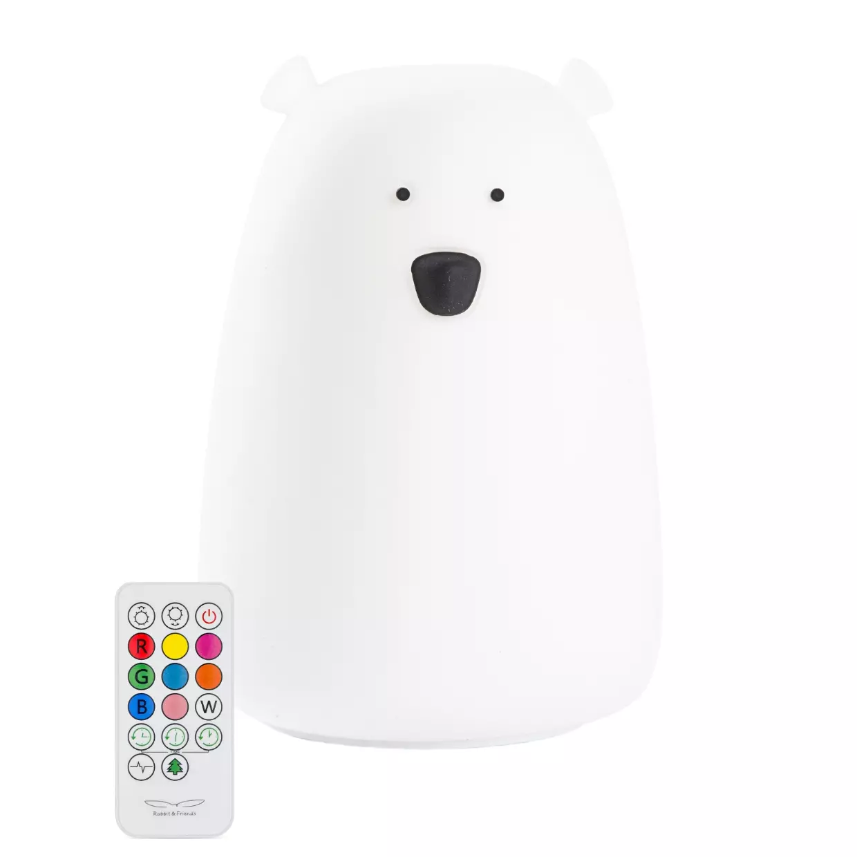 Rabbit & Friends yövalo Bear on ladattava yövalo, jota voidaan ohjata kaukosäätimellä. Lämpimästi valaiseva yövalo voidaan laittaa esimerkiksi lapsen yöpöydälle tai koristeeksi pöydälle, tai antamaan himmeää valoa vaipanvaihdossa yöaikaan. Valittavissa on seitsemän eri väriä, joita saa vaihdettua kätevästi kaukosäätimellä. Se on valmistettu pehmeästä silikonista eikä se kuumene käytössä. Yövalo valaisee jopa 12 tunnin ajan täyteen ladattuna. Yövalo toimii napauttamalla, ja siinä on automaattinen sammutusmahdollisuus kahden tunnin kuluttua.