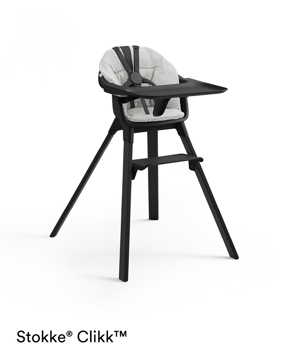 Stokke Clikk syöttötuoli ja pehmuste sisältää Clikk tuoliin sopivan pehmusteen värissä Nordic Grey, sekä Clikk syöttötuolin haluamassasi värissä.