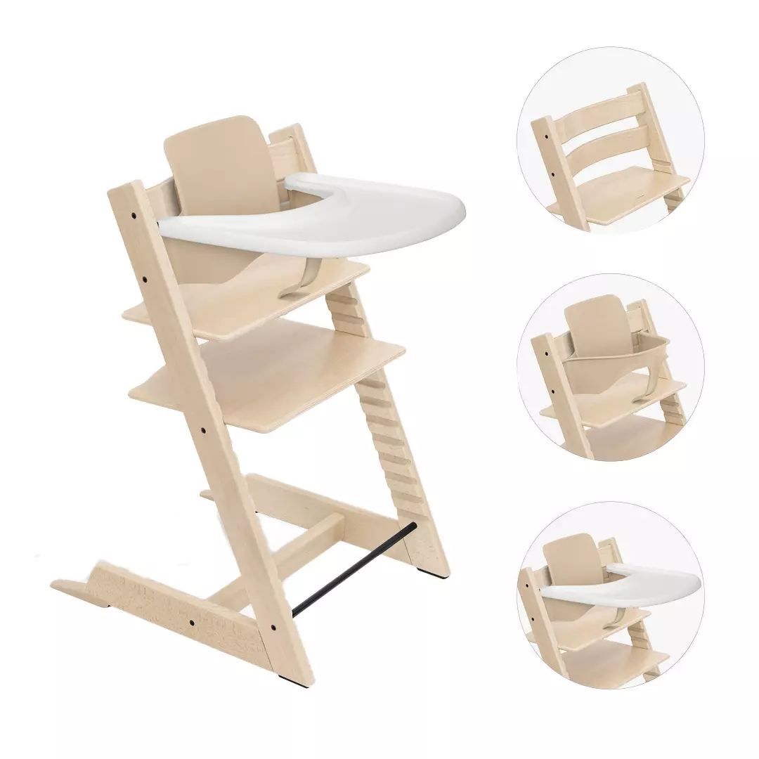 Stokke Tripp Trapp bundle tarjottimella on valmis syöttötuolipaketti, joka sopii käyttöön lapselle noin kuuden kuukauden iästä alkaen. Tämä kätevä Tripp Trapp aloituspaketti sisältää Tripp Trapp tuolin (Natural, pyökki) ja Baby Set 2 etukaaren (alk 6kk+, Natural) sekä valkoisen tarjottimen. Syöttötuoli kasvaa aina aikuisikään asti.