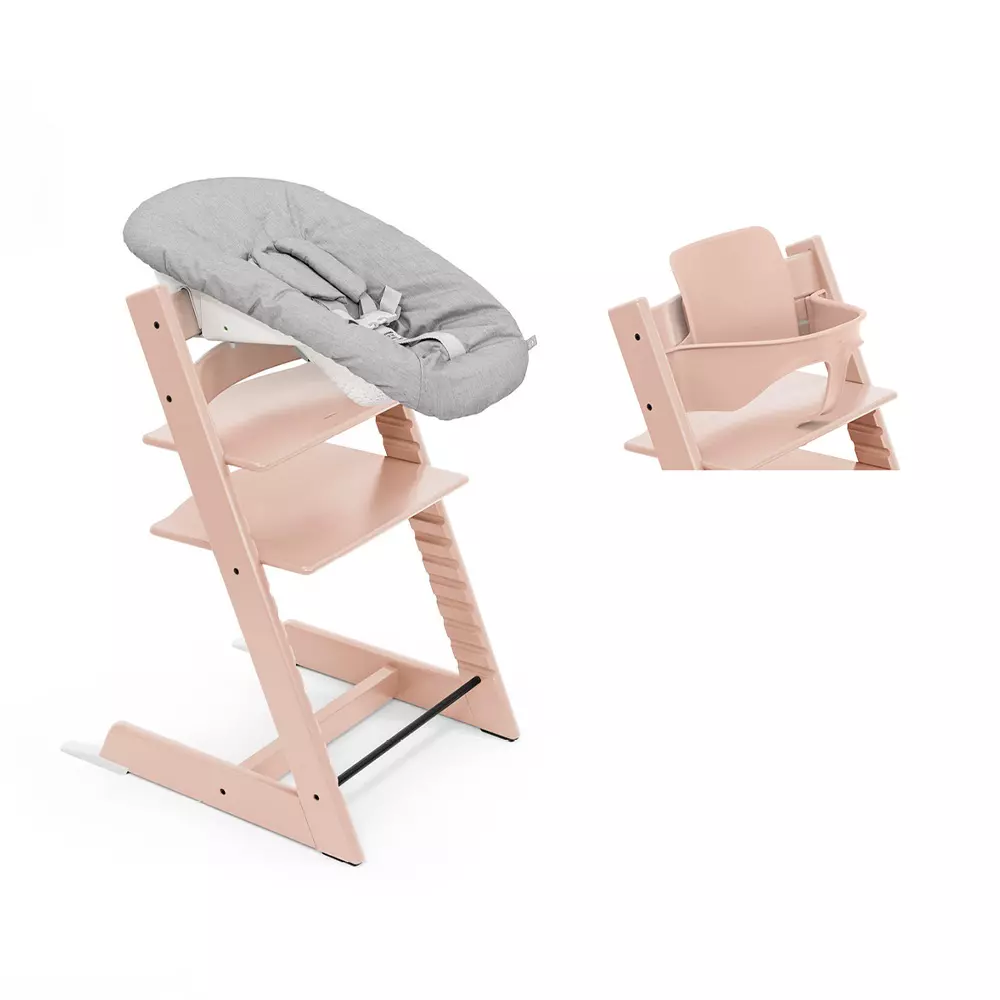 Stokke Tripp Trapp syöttötuoli etukaarella ja Newborn Set -istuimella