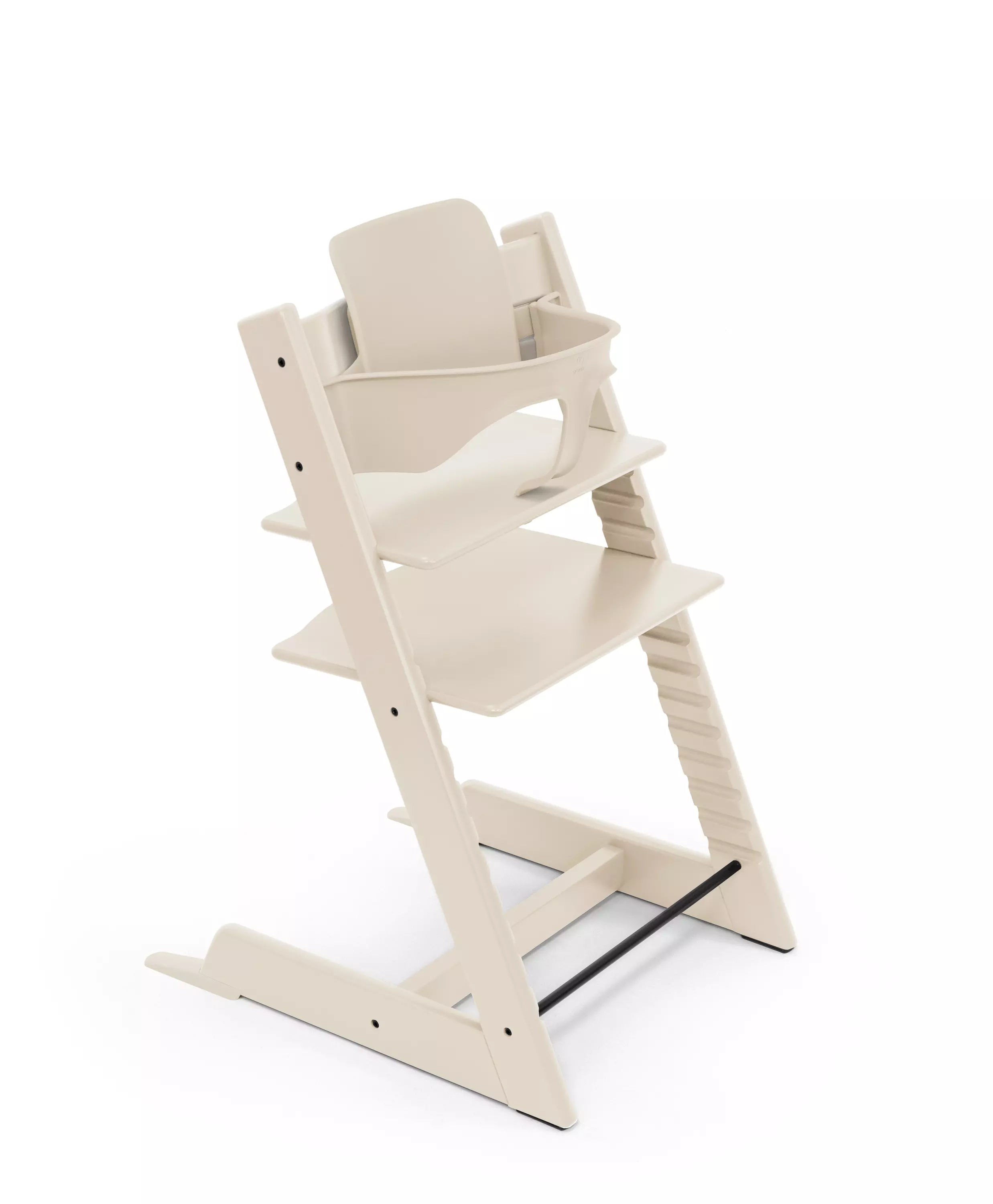 Stokke Tripp Trapp tuoli ja Baby Set etukaari -syöttötuolipaketti sopii käyttöön lapselle noin 6 kuukauden iästä alkaen. Stokke Tripp Trapp on kasvavien syöttötuolien uranuurtaja, joka on suunniteltu jo vuonna 1972. Ainutlaatuisen syöttötuolin käytön voi aloittaa jo vauvasta erikseen ostettavan Newborn Set:n kanssa. Syöttötuoli kasvaa aina aikuisikään asti. Paketti sisältää Tripp Trapp tuolin (Vanilla White, pyökki) ja Baby Set 2 etukaaren (6kk+).