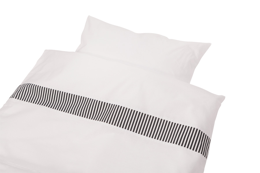Unina pussilakanasetti 85x124cm pakkaus sisältää pussilakanan ja tyynyliinan. Valkoisessa pohjassa kiertää musta-valkoraidallinen nauha.