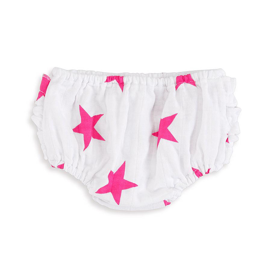 Aden+anais Ruffle Bloomer alushousut on tarkoitettu puettavaksi vaipan päälle. Suloisissa alushousuissa on hauskat röyhelöt sen takapuolella ja kuminauhat kiertää vyötäröllä sekä lahkeensuissa. Alushousut on valmistettu kestävästä harsokankaasta, johon on lisätty sopivassa suhteessa elastaania. Kangas on siis käytännöllinen, kestävä ja joustava. Harsokangas on loistava materiaali varsinkin kesällä, jolloin se hengittää ja ei ole liian kuuma.