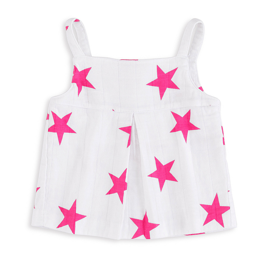 Aden+anais Smock Top toppi on kevyt ja kesäinen paita lapsellesi. Toppi on valmistettu kestävästä harsokankaasta, johon on lisätty sopivassa suhteessa elastaania. Kangas on siis käytännöllinen, kestävä ja joustava. Harsokangas on loistava materiaali varsinkin kesällä, jolloin se hengittää ja ei ole liian kuuma. Topissa on ohuet olkaimet ja se saadaan kiinnitettyä takaa kahdella nepparilla.