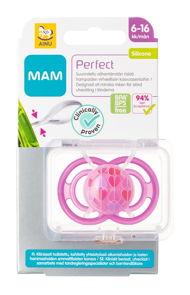 Ainu Mam Perfect silikoninen tutti 6+ kk on uusi, hampaisiin kohdistuvaa painetta vähentävä huvitutti. Se on ohuin, pehmein ja joustavin tutti, jonka kaula on tavallista tuttia 60 % ohuempi ja 3 kertaa pehmeämpi. Tuttia imiessä hammasvallien väliin jää vain 3.2 mm aukko.