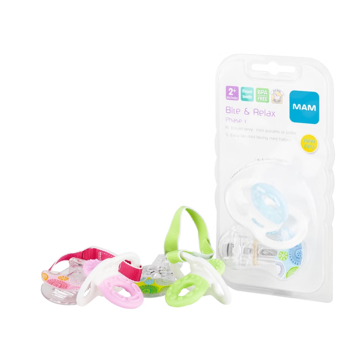 Ainu Mam Bite&Relax purulelu ja pidike +2 kk on erittäin kevyt mini purulelu ja pidike. Purulelussa on neljä erilaista pintaa ja purulelu saadaan pidikkeen avulla kiinnitettyä esimerkiksi lapsen vaatteisiin.