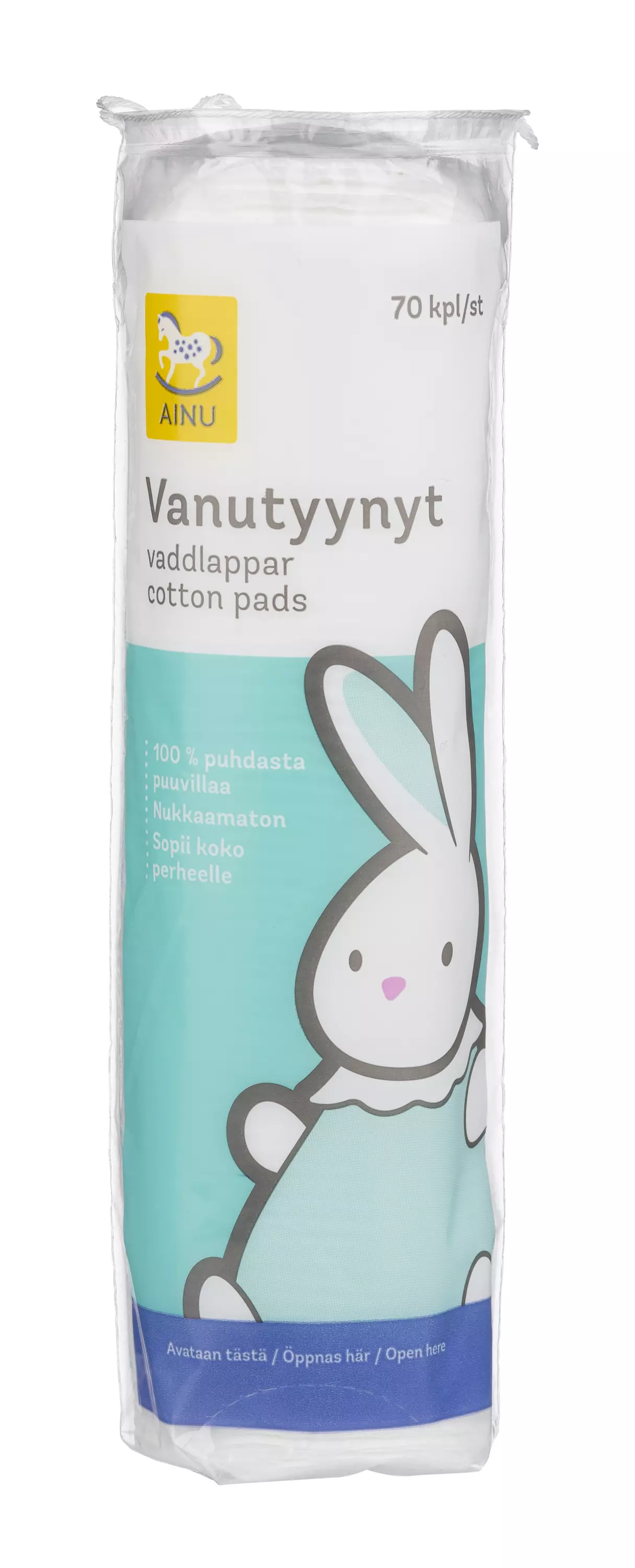 Ainu vanutyynyt ovat erittäin imukykyistä, puhdistettua 100 %:sta puuvillaa. Nukkaamattomia. Vanutyynyt sopivat vauvan hellään ihonhoitoon sekä yleisesti ihon hellävaraiseen puhdistamiseen, yleishygieniaan ja kauneudenhoitoon.
