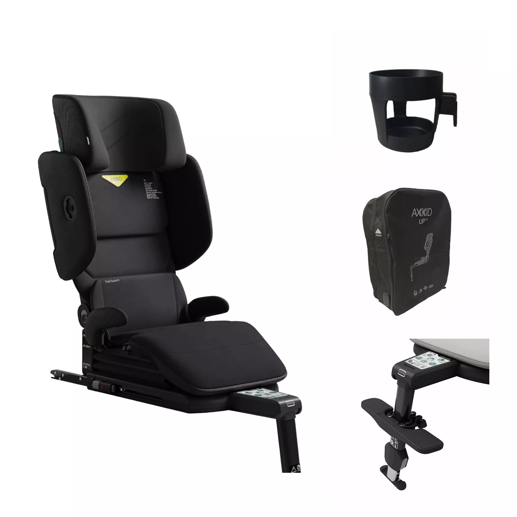 Axkid UP turvavyöistuin (100-150cm) ja lisävarusteet jalkatuki istuimeen, kuljetuslaukku ja mukiteline kätevänä tuotepakettina. Axkid UP on innovatiivinen istuin 100-150cm pituisille ja 15-50 kg painoisille lapsille. Pitkäikäinen Axkid UP turvavyöistuin on maailman ainoa istuin, jossa on patentoitu korotettava istuinosa, joka mahdollistaa optimaalisen turvavyön reitityksen parantaen lapsen turvallisuutta huomattavasti. Axkid UP turvavyöistuimessa on käytetty ProTecBase -teknologiaa, joka vähentää törmäysvoimia jopa 25%. Istuimessa on ASIP -sivutörmäyssuoja. UN R129 sertifioitu istuin on testattu jopa 50 kg asti.