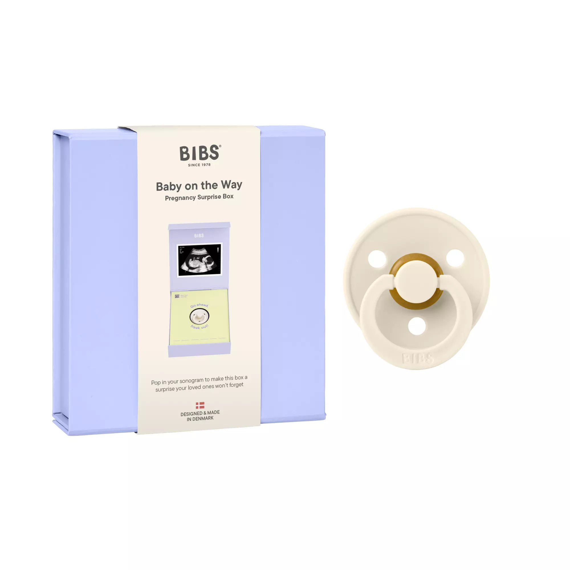BIBS lahjapakkaus Baby on the Way on hauska tapa kertoa raskaudesta. Tyylikäs lahjapakkaus sisältää perinteisen BIBS tutin luonnonvalkoisena, sekä paikan ultraäänikuvalle.