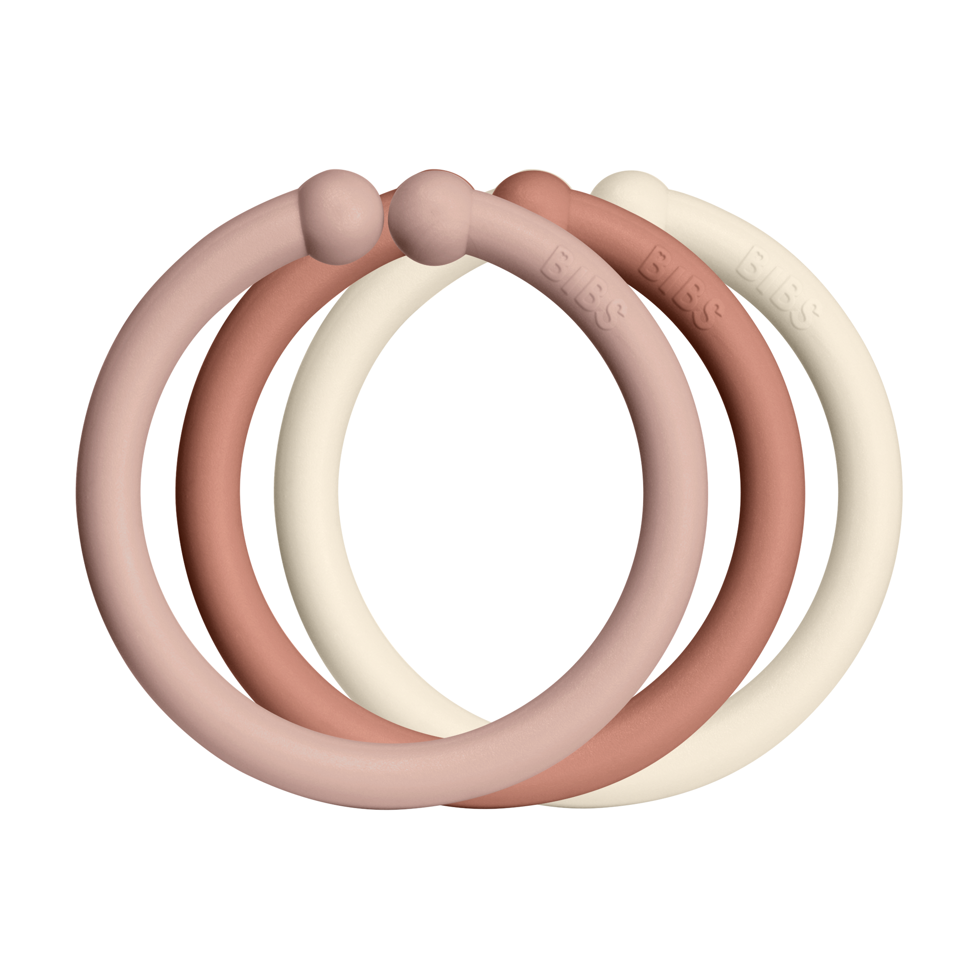 BIBS Loop kiinnitysrenkaiden avulla voit kiinnittää esimerkiksi lelut ja vaunuverhot kiinni lastenvaunujen tai rattaiden kuomuun tai pinnasängyn reunaan. Renkaat voi myös yhdistää pitkäksi leluksi jota lapsi voi tunnustella. Pakkaus sisältää 12 kappaletta renkaita kolmessa värissä.
