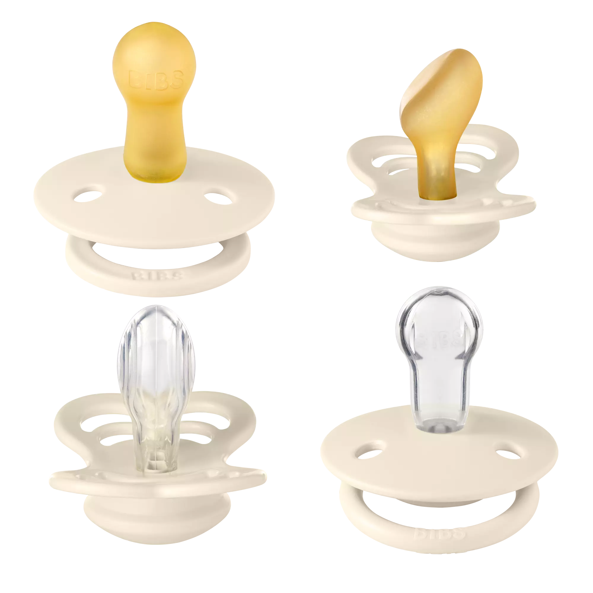 BIBS Try-It Collection 4kpl sisältää neljä erilaista BIBS tuttia koossa 2 (6-18kk). Pakkaus sisältää kaksi tuttia luonnonkumisella imuosalla ja kaksi tuttia silikonisella imuosalla. Suojakilpi on valmistettu polypropyleenistä (PP), joka on materiaalina kevyt ja kestävä.