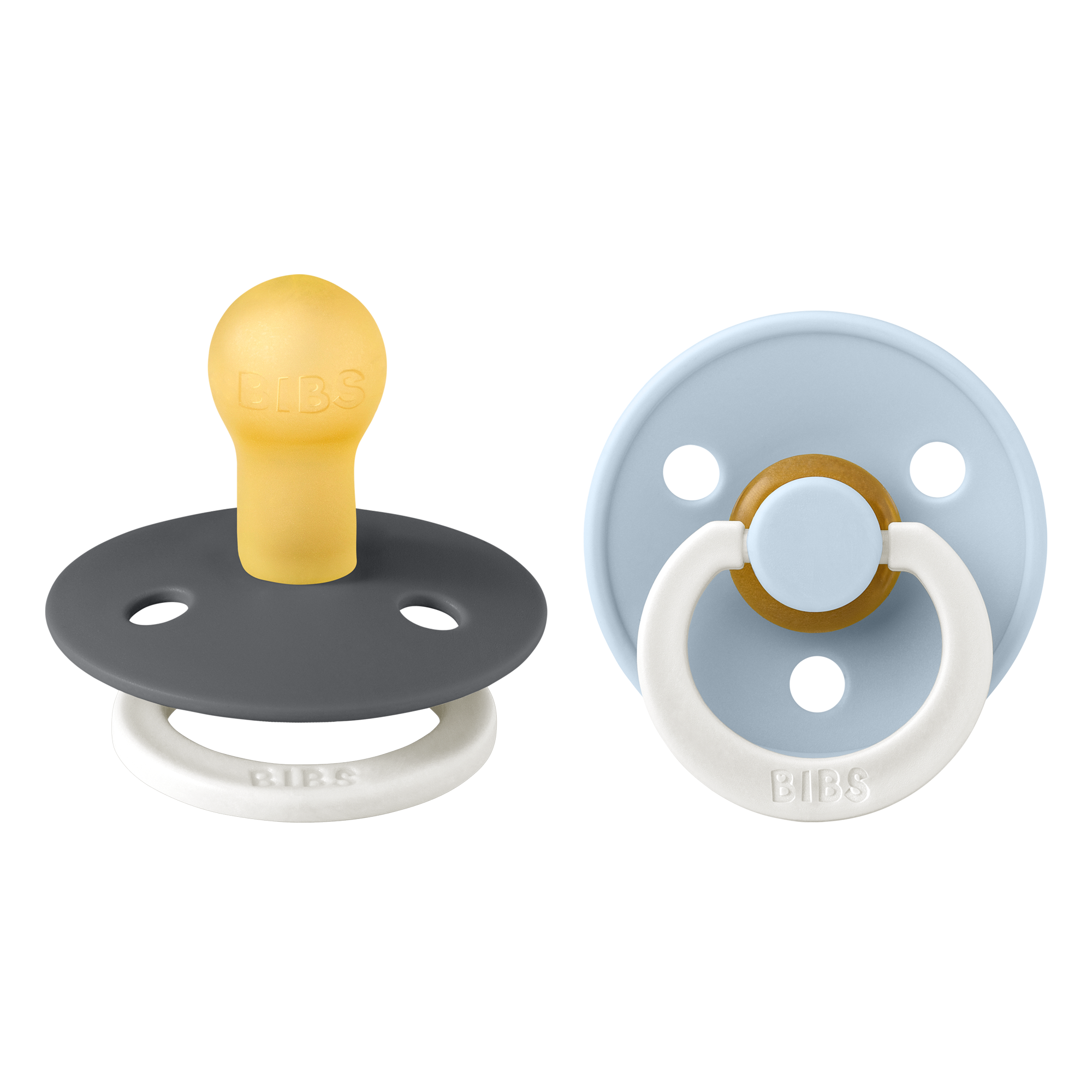 BIBS yötutti 0-6kk 2kpl "Iron/Baby Blue"" on perinteinen tutti, jossa on luonnonkuminen imuosa ja pyöreä suojakilpi. Yötutin valkoinen rengas hohtaa pimeässä, jolloin se on helpompi löytää. BIBS tutteja on valmistettu jo yli 50 vuoden ajan Tanskassa. Imuosa on kirsikanmuotoinen ja se on kehitetty rauhoittamaan ja lohduttamaan lasta. Imuosa mukailee rinnan muotoa ja näin tukee imemisrefleksiä. Pakkaus sisältää 2 kpl BIBS tuttia.