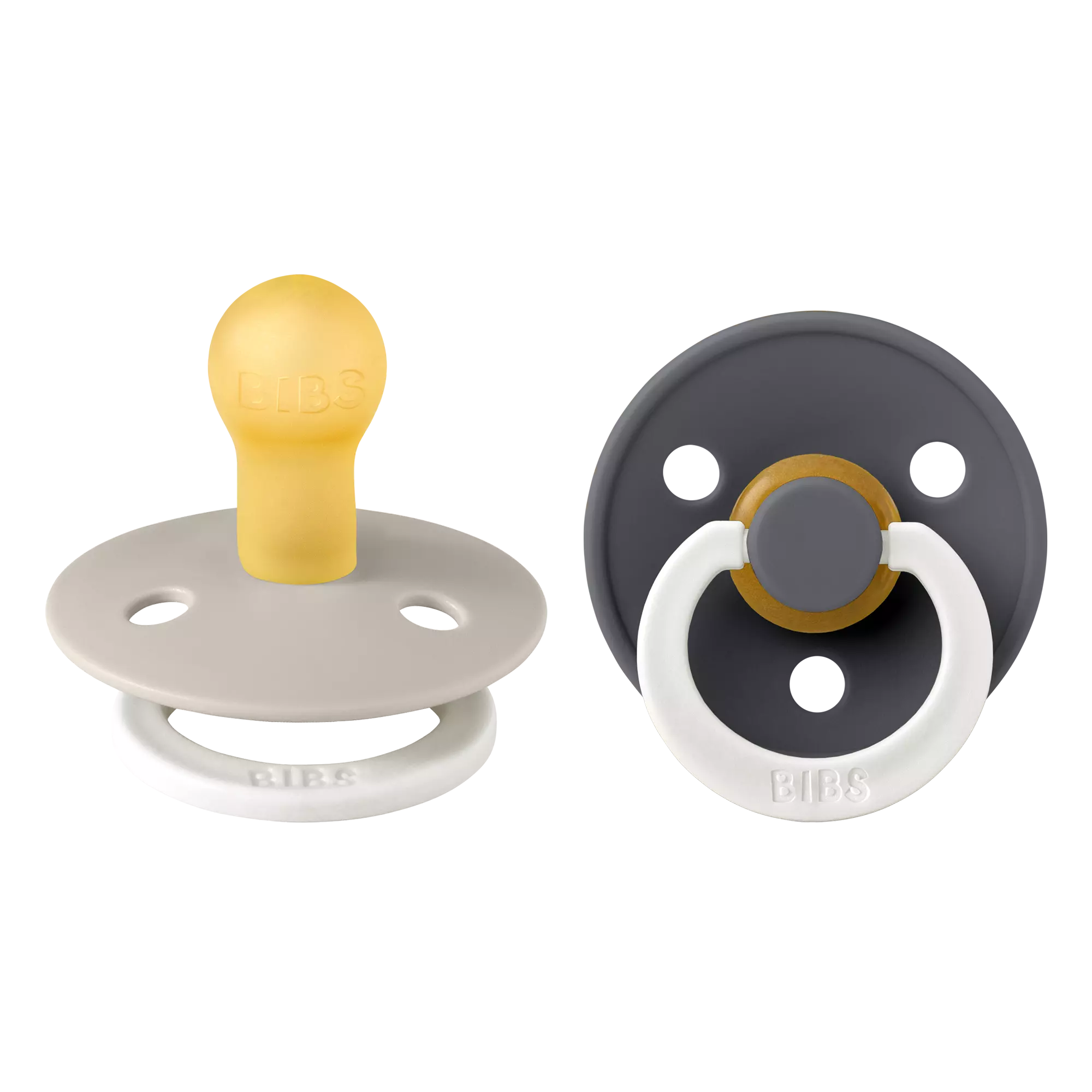 BIBS yötutti 0-6kk 2kpl "Sand/Iron" on perinteinen tutti, jossa on luonnonkuminen imuosa ja pyöreä suojakilpi. Yötutin valkoinen rengas hohtaa pimeässä, jolloin se on helpompi löytää. BIBS tutteja on valmistettu jo yli 50 vuoden ajan Tanskassa. Imuosa on kirsikanmuotoinen ja se on kehitetty rauhoittamaan ja lohduttamaan lasta. Imuosa mukailee rinnan muotoa ja näin tukee imemisrefleksiä. Pakkaus sisältää 2 kpl BIBS tuttia.
