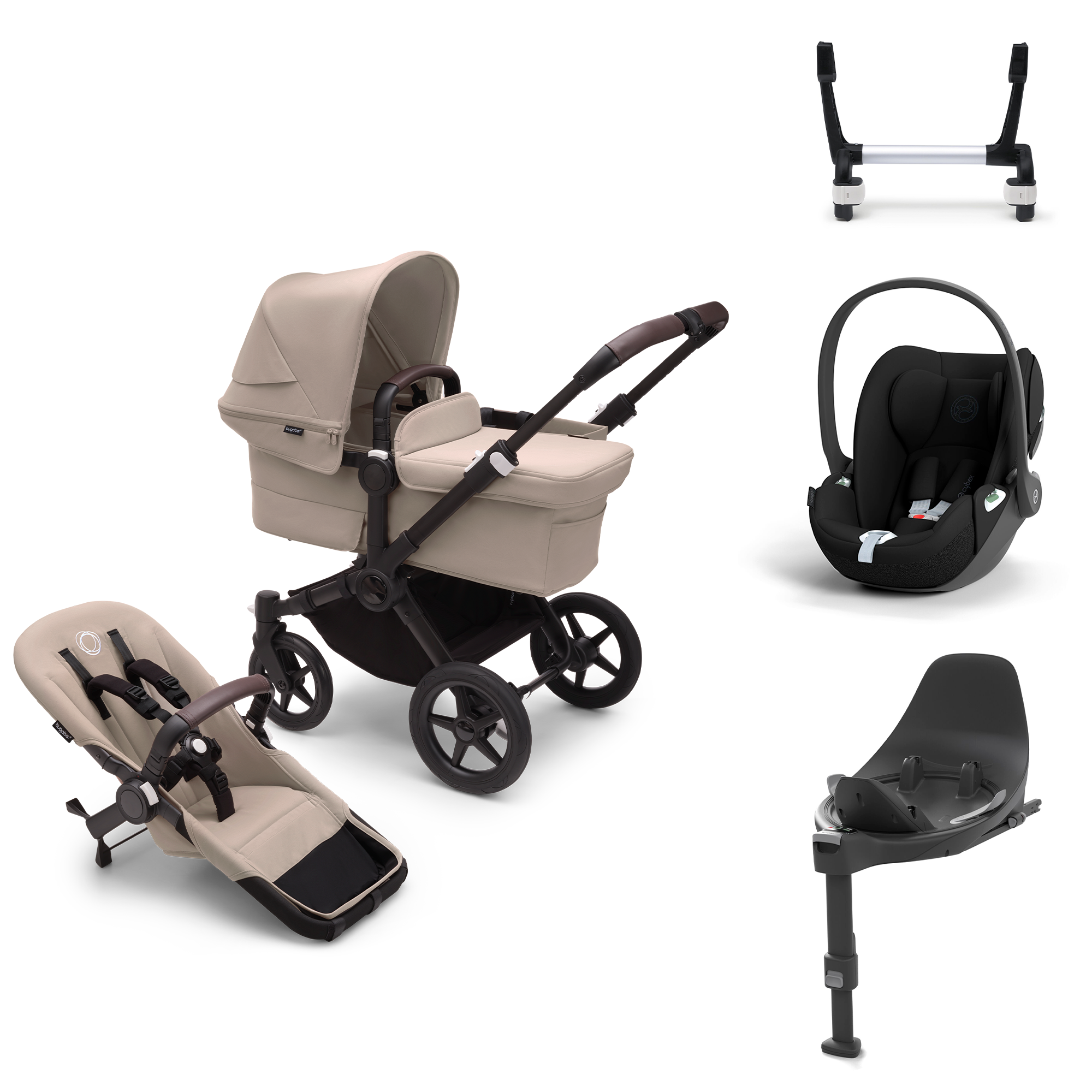 Bugaboo Donkey5 Mono starttipaketti on kattava vaunupaketti vauvan kanssa liikkumiseen. Starttipaketti sisältää Donkey5 Mono yhdistelmävaunut (väri Desert Taupe/Black runko), Cybex Cloud T turvakaukalon, Base T isofix-telakan ja adapterin, jolla turvakaukalo voidaan kiinnittää rattaan runkoon.