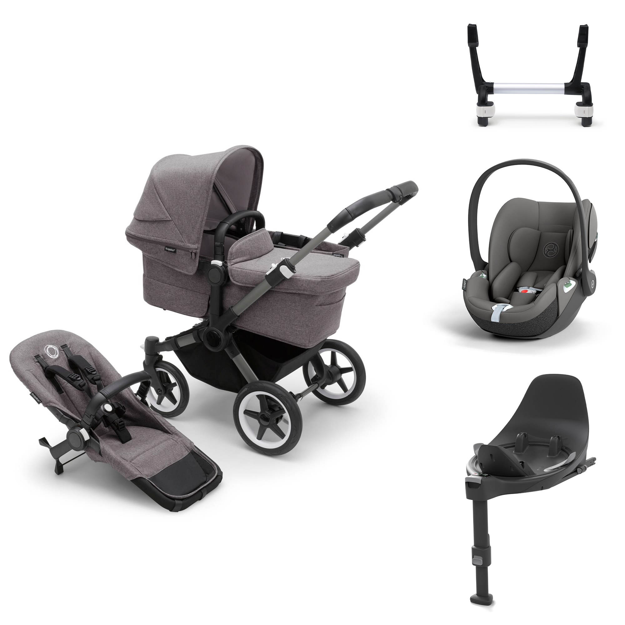 Bugaboo Donkey5 Mono starttipaketti on kattava vaunupaketti vauvan kanssa liikkumiseen. Starttipaketti sisältää Donkey5 Mono yhdistelmävaunut (väri Grey Melange/Graphite runko), Cybex Cloud T turvakaukalon, Base T isofix-telakan ja adapterin, jolla turvakaukalo voidaan kiinnittää rattaan runkoon.