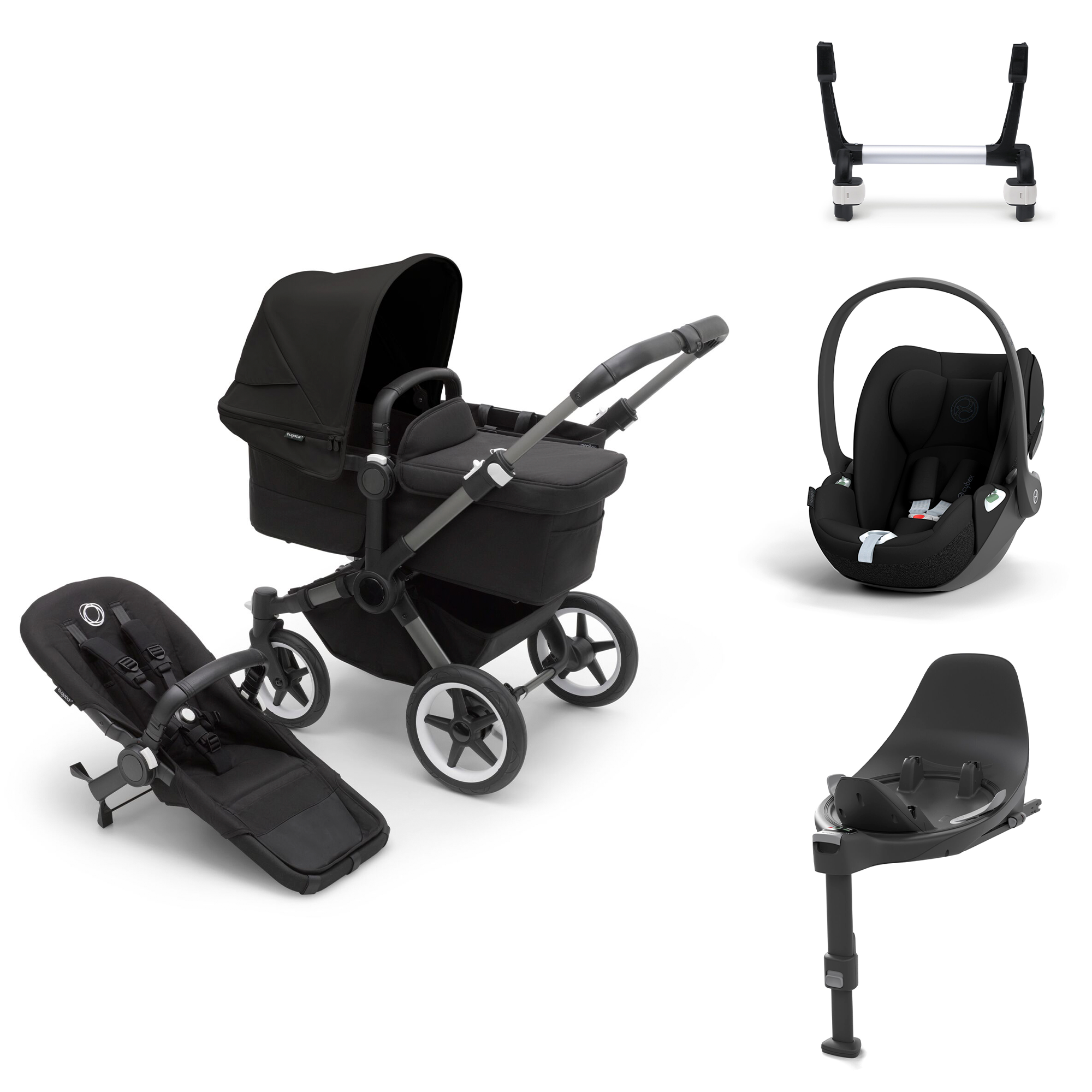 Bugaboo Donkey5 Mono starttipaketti on kattava vaunupaketti vauvan kanssa liikkumiseen. Starttipaketti sisältää Donkey5 Mono yhdistelmävaunut (väri Midnight Black/Graphite runko), Cybex Cloud T turvakaukalon, Base T isofix-telakan ja adapterin, jolla turvakaukalo voidaan kiinnittää rattaan runkoon.