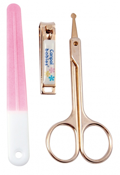 Canpol Babies kynsisaksisetti sisältää vauvaturvalliset metalliset kynsisakset, kynsileikkurin ja viilan. Viilan väri vaikuttaa pakkauksen väriin.