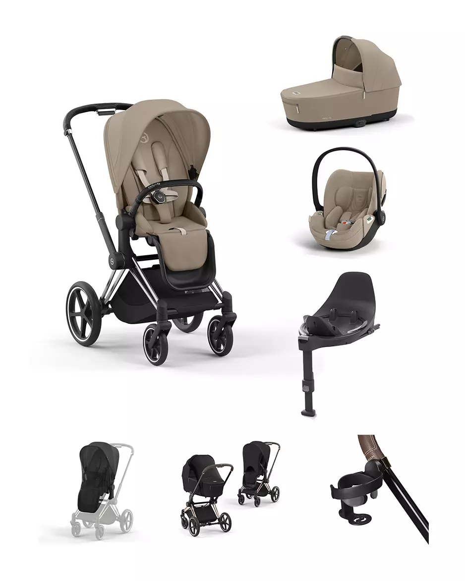 Cybex Priam 4 starttipaketti lisävarusteilla on laaja starttipaketti vauvan kanssa liikkumiseen. Paketti sisältää Priam 4 yhdistelmävaunut Chrome Black-rungolla, Cloud T turvakaukalon , Base T telakan, sadesuojat vaunukoppaan ja rattaaseen, 2in1 mukitelineen, sun sail aurinkosuojan, hyönteissuojan ratasosaan ja Cybex Platinum lämpöpussin. Tyylikkäät ja monipuoliset Cybex Priam 4 yhdistelmävaunut sopivat käyttöön lapsella vastasyntyneestä noin 4 vuoteen asti. Lisäksi paketti sisältää sadesuojat vaunukopalle ja rattaalle sekä turvakaukaloadapterit, joiden avulla voit kiinnittää kaukalon rattaan runkoon.