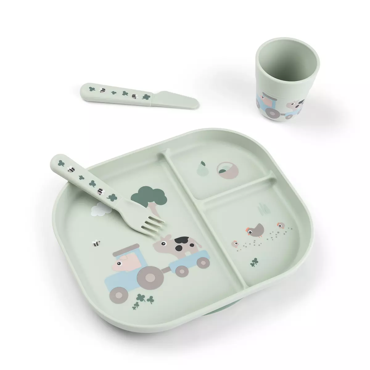 Done By Deer Foodie Celebration ruokailusetti sisältää lautasen, mukin sekä haarukan ja veitsen. Tämän lisäksi paketissa on vielä pieni kirja. Tämä setti sisältää kaiken tarpeellisen lapselle, joka alkaa harjoittelemaan itsenäistä syömistä. Lautasessa on anti-slip pohja, joka estää lautasta liukumasta pöydällä.