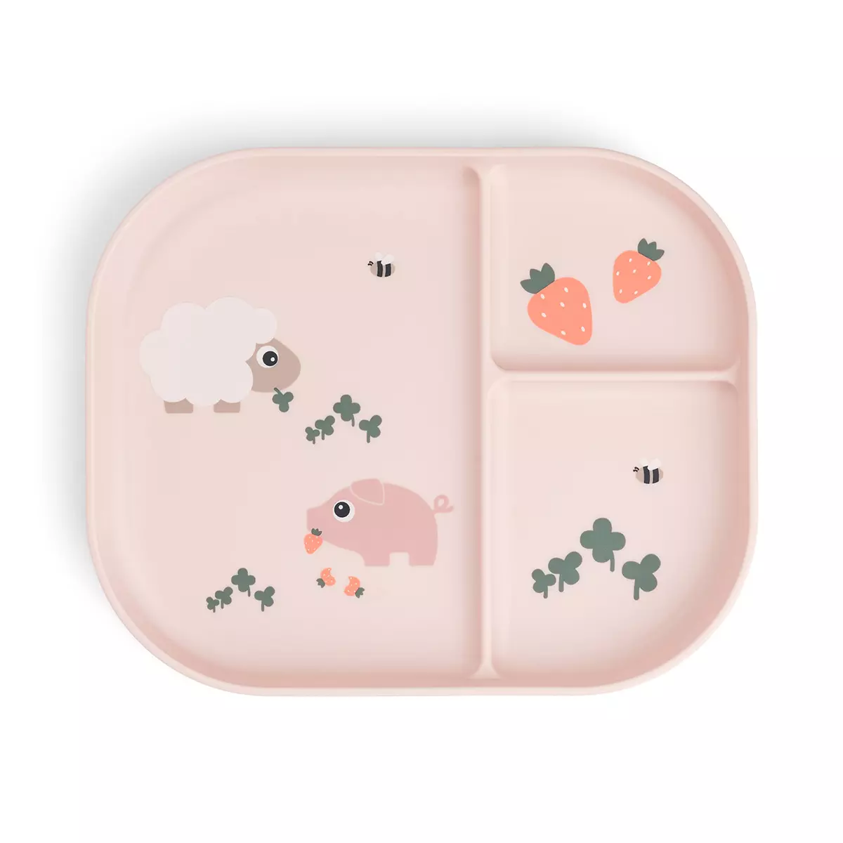 Done by Deer Foodie Tiny Farm lokerolautanen on korkeareunainen lautanen, jossa on kolme lokeroa sekä anti-slip pohja, joka estää lautasen liukumisen pöydällä. Lokerolautasella ruoat on helppo jakaa eri lokeroihin.