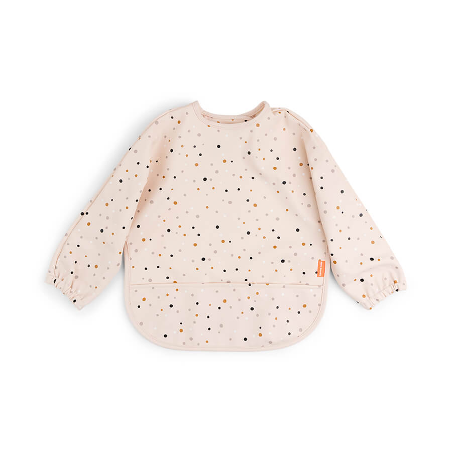 Done by Deer hihallinen ruokalappu "Happy Dots Powder" sopii noin 6-18kk ikäisille lapsille. Ruokalapussa on pitkät hihat ja se saadaan kiinnitettyä niskan takaa pehmeällä tarranauhalla. Selästä ruokalappu on avoin ja hihoissa on kiristys ettei ruoka pääse hihan sisään. Ruokalappu on valmistettu pehmeästä materiaalista.