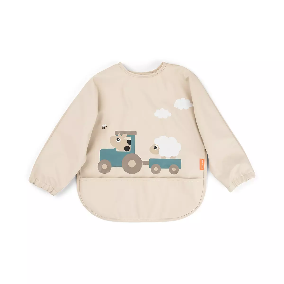 Done By Deer hihallinen ruokalappu Tiny Farm Sand suojelee lapsen vaatteita itsenäistä syömistä opetellessa. Ruokalappu on vedenkestävä, ja on helppo putsata kostealla rätillä. Tarvittaessa ruokalapun voi pestä myös pesukoneessa. Ruokalapussa on käytännölliset hihat, ja hihojensuissa kuminauhat. Ruokalappu saadaan suljettua ja avattua helposti niskassa olevan nepparikiinnityksen avulla.