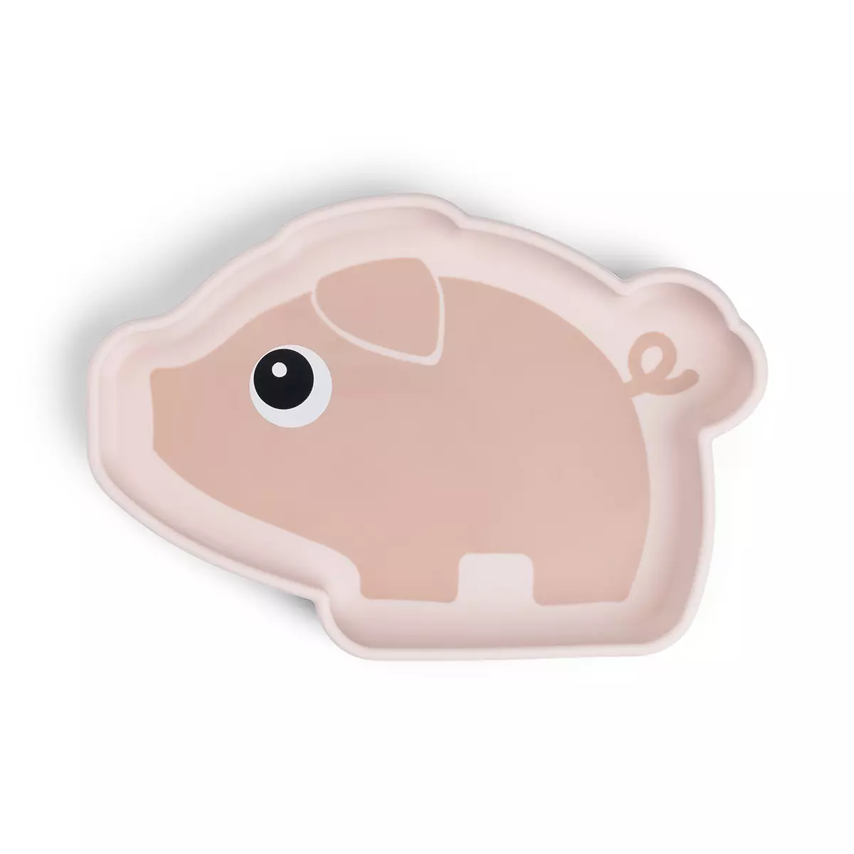 Done by Deer silikoninen imukuppilautanen on suloisen Pigee-possun muotoinen. Lautanen kiinnittyy imukupin avulla tasaiselle pöydälle painamalla sen tiukasti kiinni, jolloin se ei pääse tippumaan pöydältä.