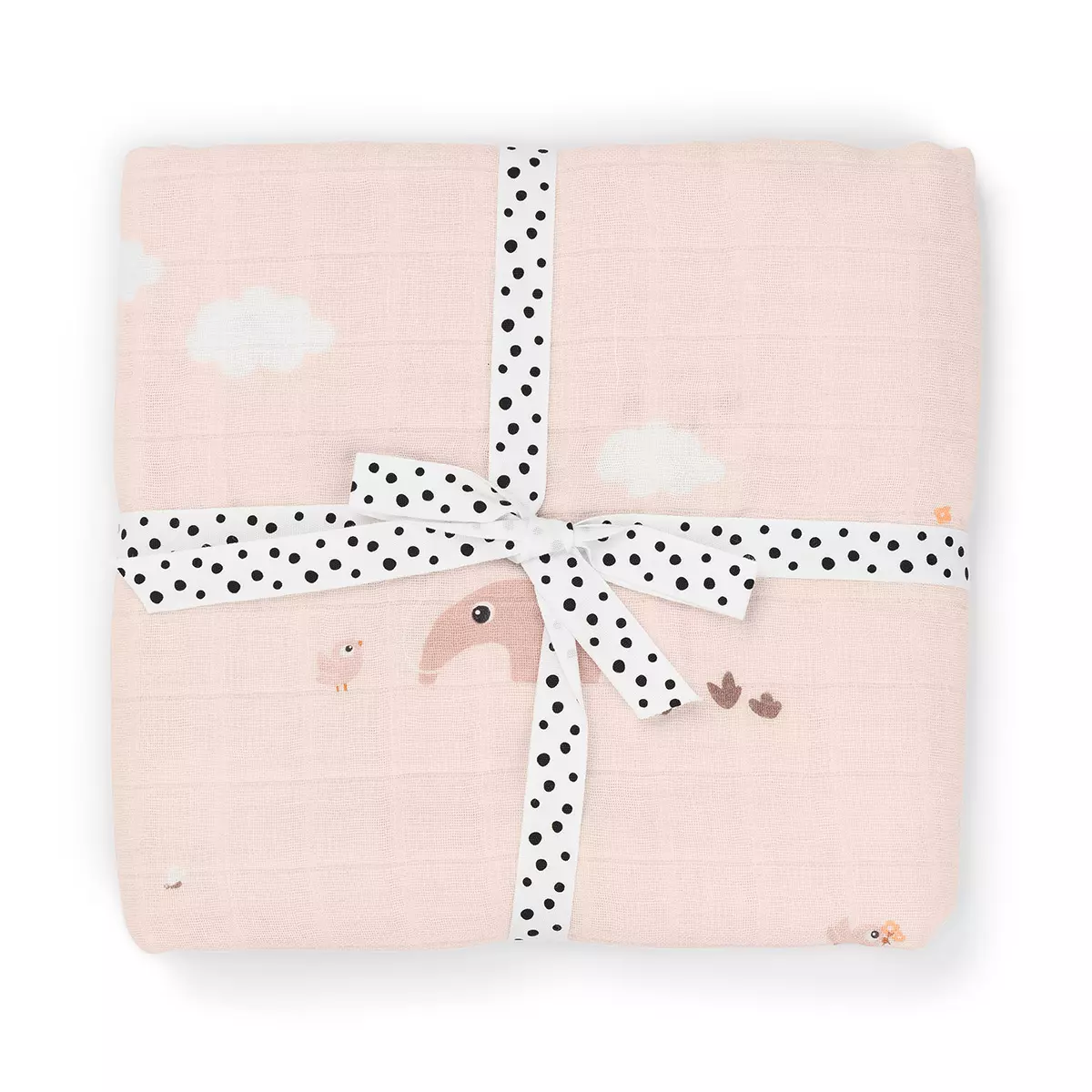 Done by Deer iso harso 120 x 120 cm kokoinen. Pehmeä ja hengittävä harso on monikäyttöinen, sitä voi käyttää esimerkiksi röyhtäyttämiseen, suojapeitteenä, kapalona tai monitoimirättinä. Vaaleanpunaisessa harsossa seikkailee suloinen Elphee norsu.