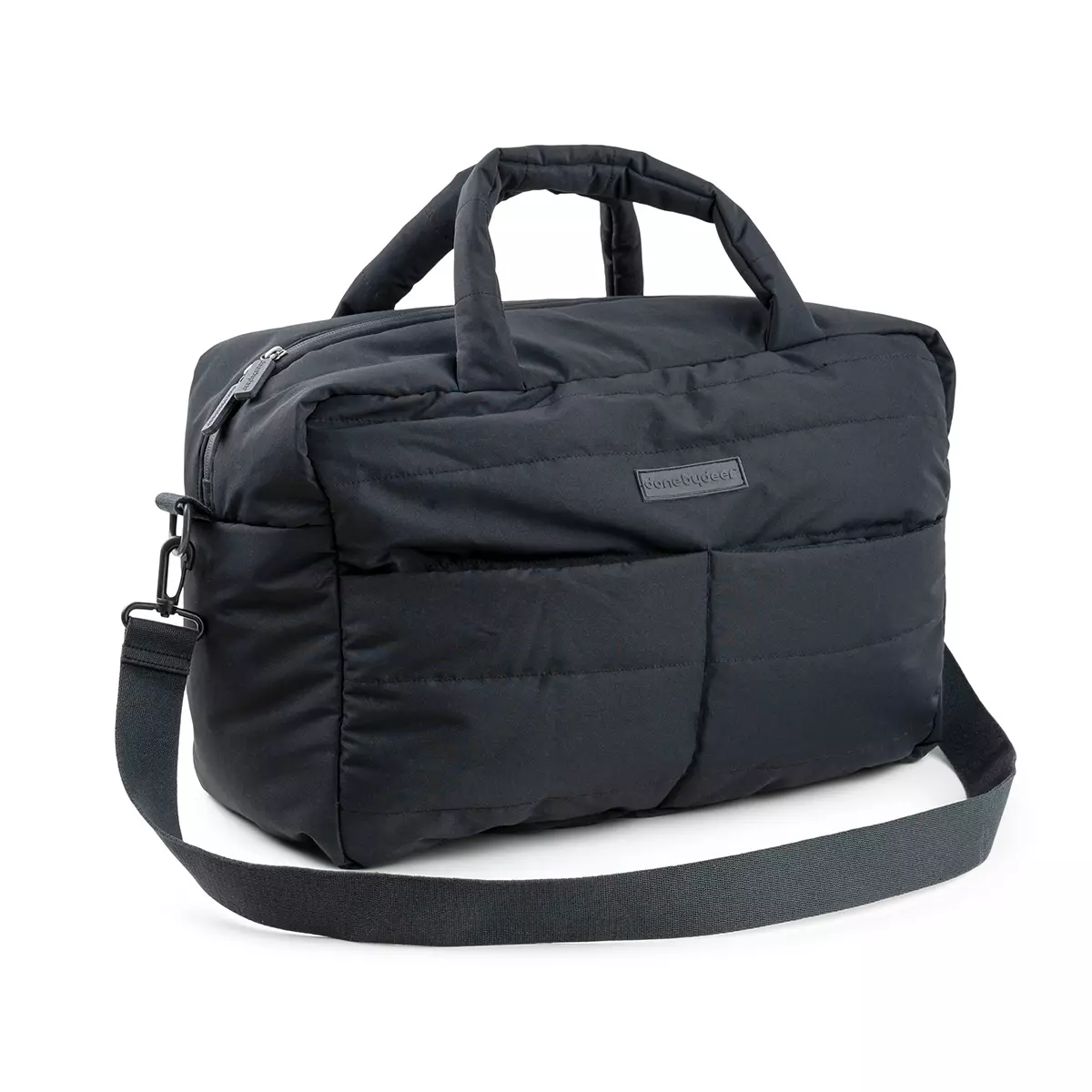 Done By Deer iso hoitolaukku on tyylikäs ja käytännöllinen. Laukku on valmistettu käyttäen kierrätettyjä muovipulloja. Tilavassa laukussa on useita taskuja, sekä yksi eristetty tasku, jossa voi säilyttää kylmiä tai kuumia nesteitä. Laukun mukana tulee kätevä hoitoalusta. Vedenkestävä laukku voidaan kiinnittää helposti rattaisiin mukana tulevien hihnojen avulla.