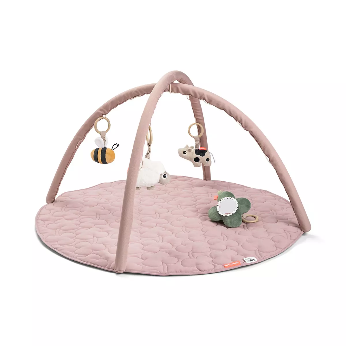 Done by Deer leikkimatto Tiny Farm on tyylikäs leikkimatto, jossa lapsen on mukava maata ja tutkia hänen päällään roikkuvia leluja. Lelujen paikkaa voidaan siirtää eri kohtiin. Leikkimatosta on mahdollista irrottaa myöhemmin kaaret, jotta mattoa voidaan käyttää erikseen.