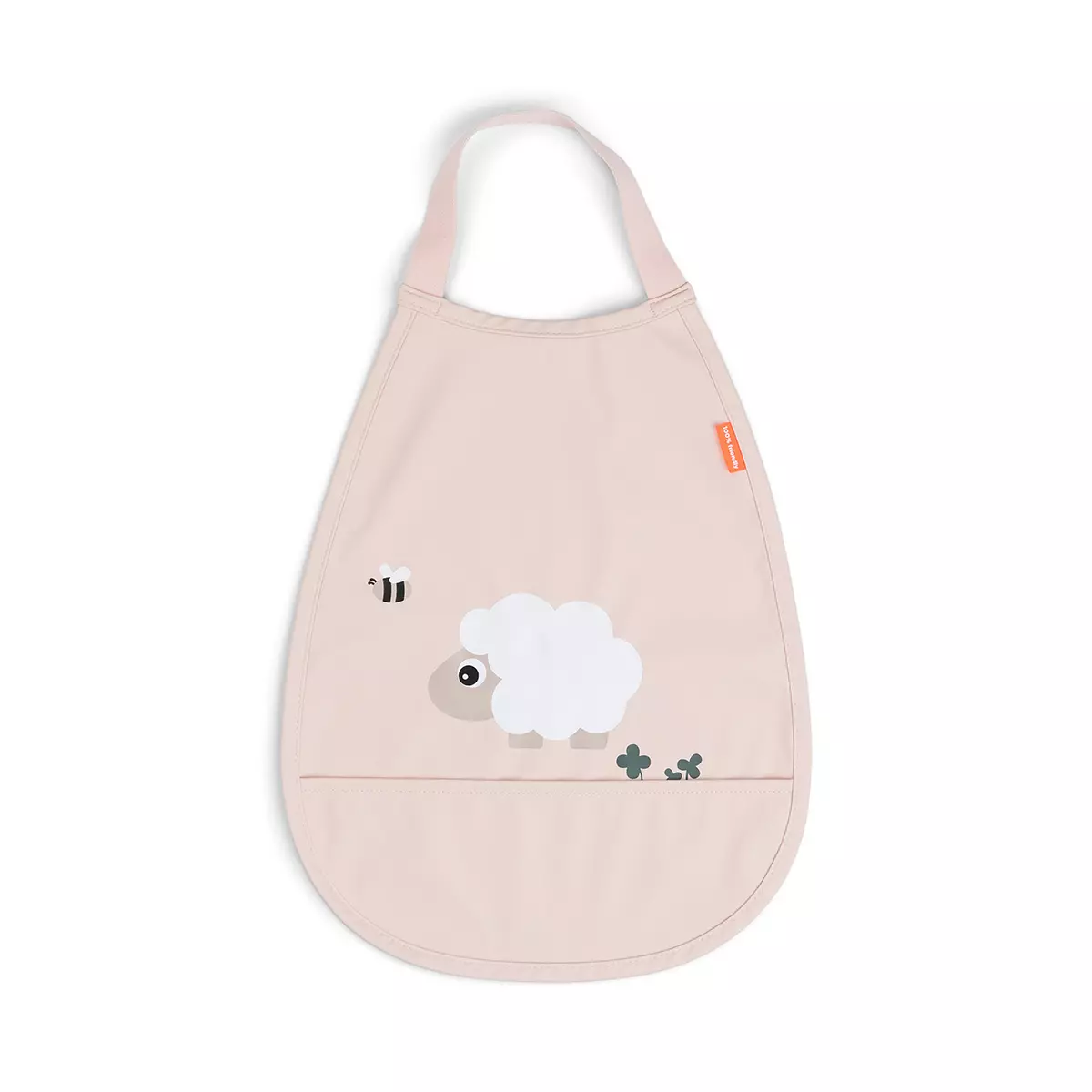 Done by Deer Tiny Farm Powder on lapsen pään yli vedettävä ruokalappu. Joustavan niskalenkin ansiosta lapsen on helppo pukea ja riisua ruokalappu itse. Ruokalapussa on kouru tippuvalle ruoalle.