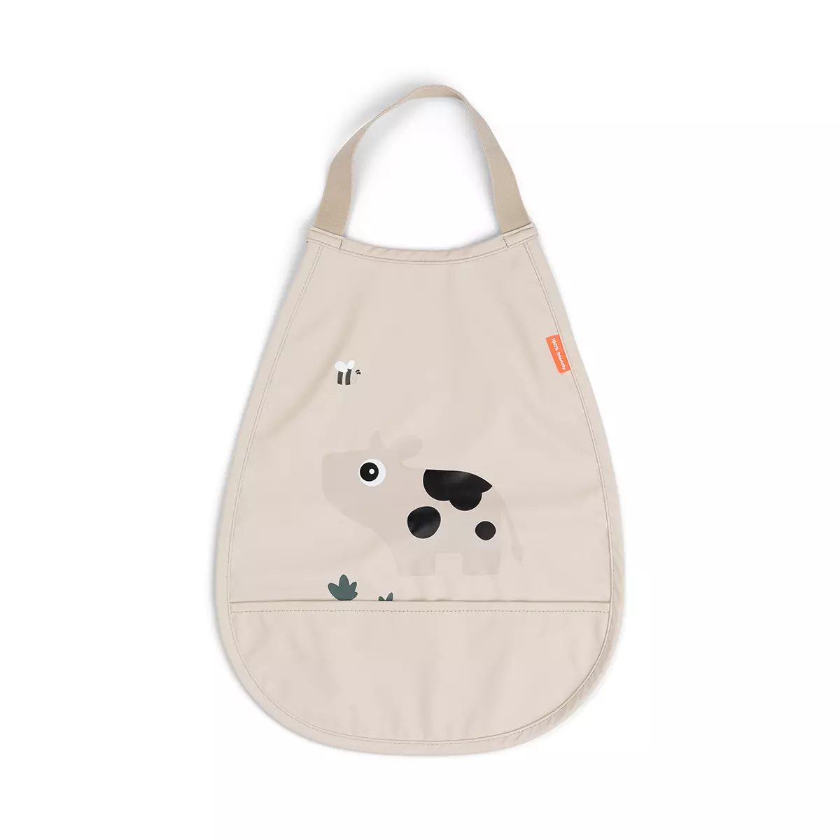 Done by Deer Tiny Farm Sand on lapsen pään yli vedettävä ruokalappu. Joustavan niskalenkin ansiosta lapsen on helppo pukea ja riisua ruokalappu itse. Ruokalapussa on kouru tippuvalle ruoalle.