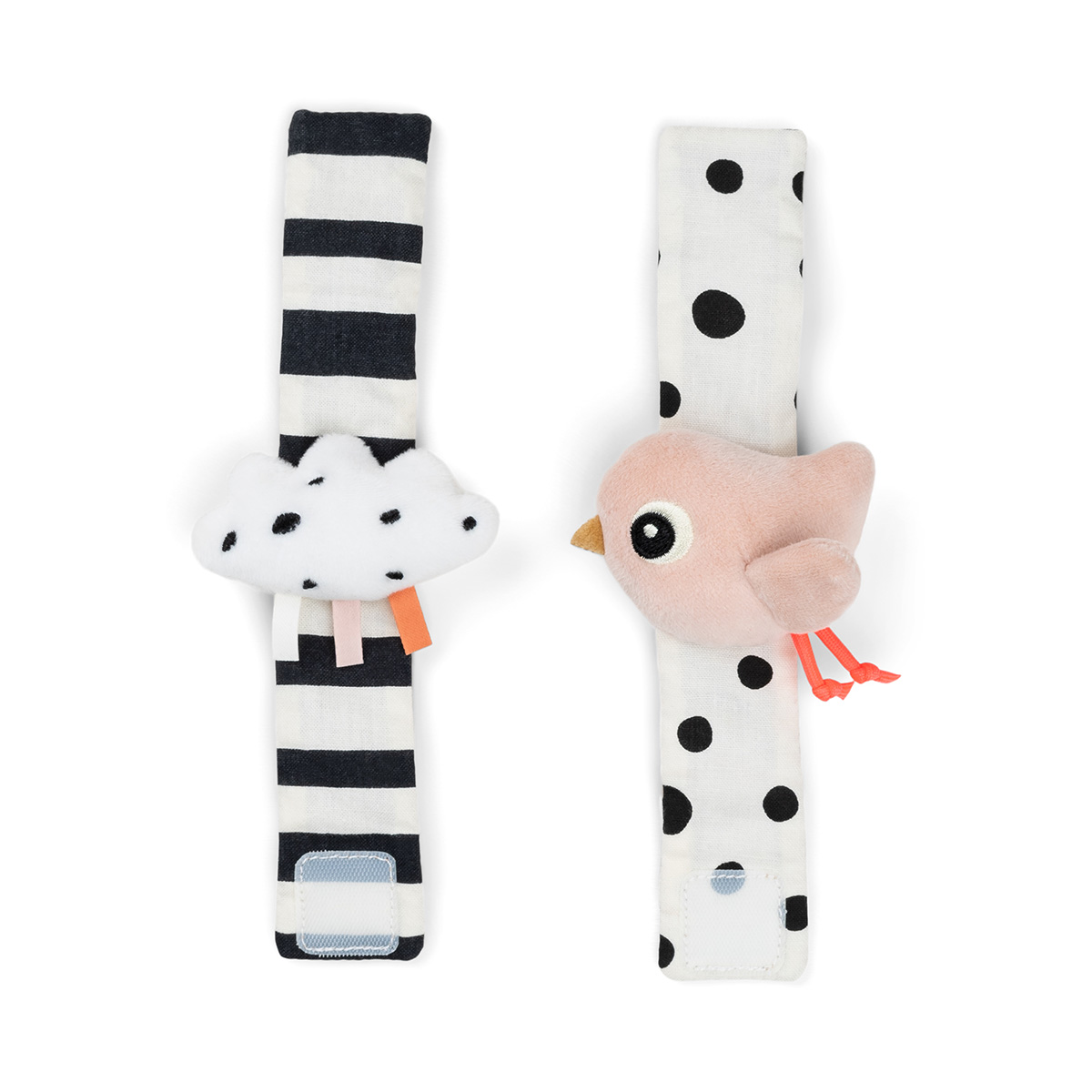 Done by Deer ranne- ja nilkkahelistimet ovat hauskat vauvan ranteisiin tai nilkkoihin kiinnitettävät helistimet. Rannekkeiden päällä on pehmeät lintu ja pilvi. Rannekkeet kiinnitetään tarralla. Helistimien lisäksi hahmot myös rapisevat, sekä kontrastivärit stimuloivat vauvaa visuaalisesti.