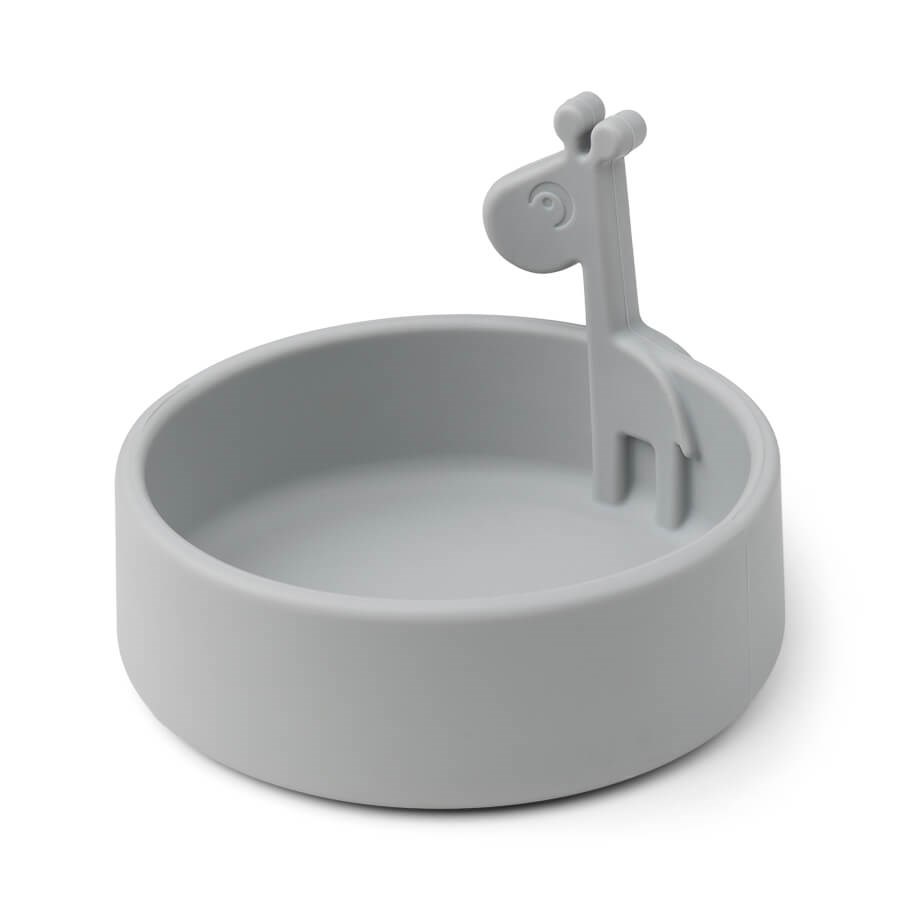 Done by Deer silikoninen kulho Peekaboo on korkeareunainen pehmeä kulho, jonka pyöristettyjen laitojen kautta lapsi saa kauhottua ruokaa helposti lusikkaan. Kulhossa on kiinteästi kiinni suloinen kirahvi. Silikoninen materiaali estää kulhoa liukumasta pyödällä.