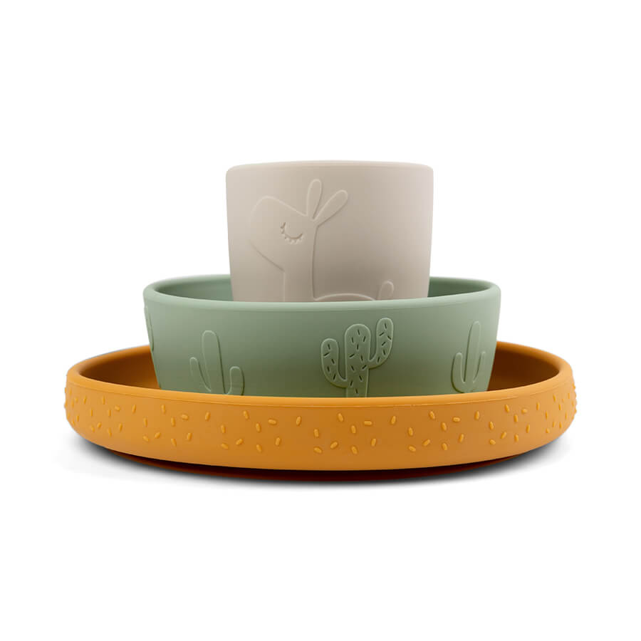 Done by Deer Stick&Stay Lalee ruokailusetti on monipuolinen lasten ruokailusetti, joka sisältää syvän lautasen, kulhon sekä mukin. Sekä lautasen että kulhon pohjassa on imukuppi, joka saa ne pysymään paikallaan koko ruokailun ajan. Imukuppi estää lasta heittämästä lautasta/kulhoa lattialle. Tuotteet on valmistettu elintarvikelaatuisesta silikonista, jolloin ne ovat särkymättömiä ja niitä voidaan käyttää mikroaaltouunissa.