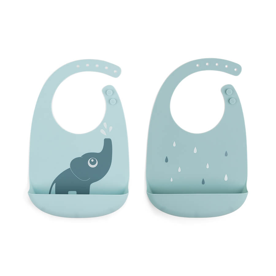 Done by Deer silikoninen ruokalappu 2 kpl paketti sisältää kaksi silikonista ruokalappua, jotka on helppo huuhdella puhtaaksi. Toista ruokalappua koristaa norsu ja toista vesipisarat. Ruokalapun kouru metsästää tippuvan ruoan, jotta ruoka ei sotke lapsen vaatteita taikka lattiaa.