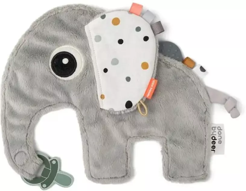 Done by Deer Cozy blanket uniliina "Elphee Grey" on todella monipuolinen ja pehmeä uniliina, jossa on useita ominaisuuksia. Uniliinassa on kaksi eri tuntoista puolta ja siinä on myös erilaisia lappuja, joita pieni lapsi voi tunnustella. Uniliinan sivulla on tarranauhallinen lenkki, johon renkaallisen tutin saa kiinnitettyä ja näin lapsi löytää tutin helpommin itse myös pimeässä.