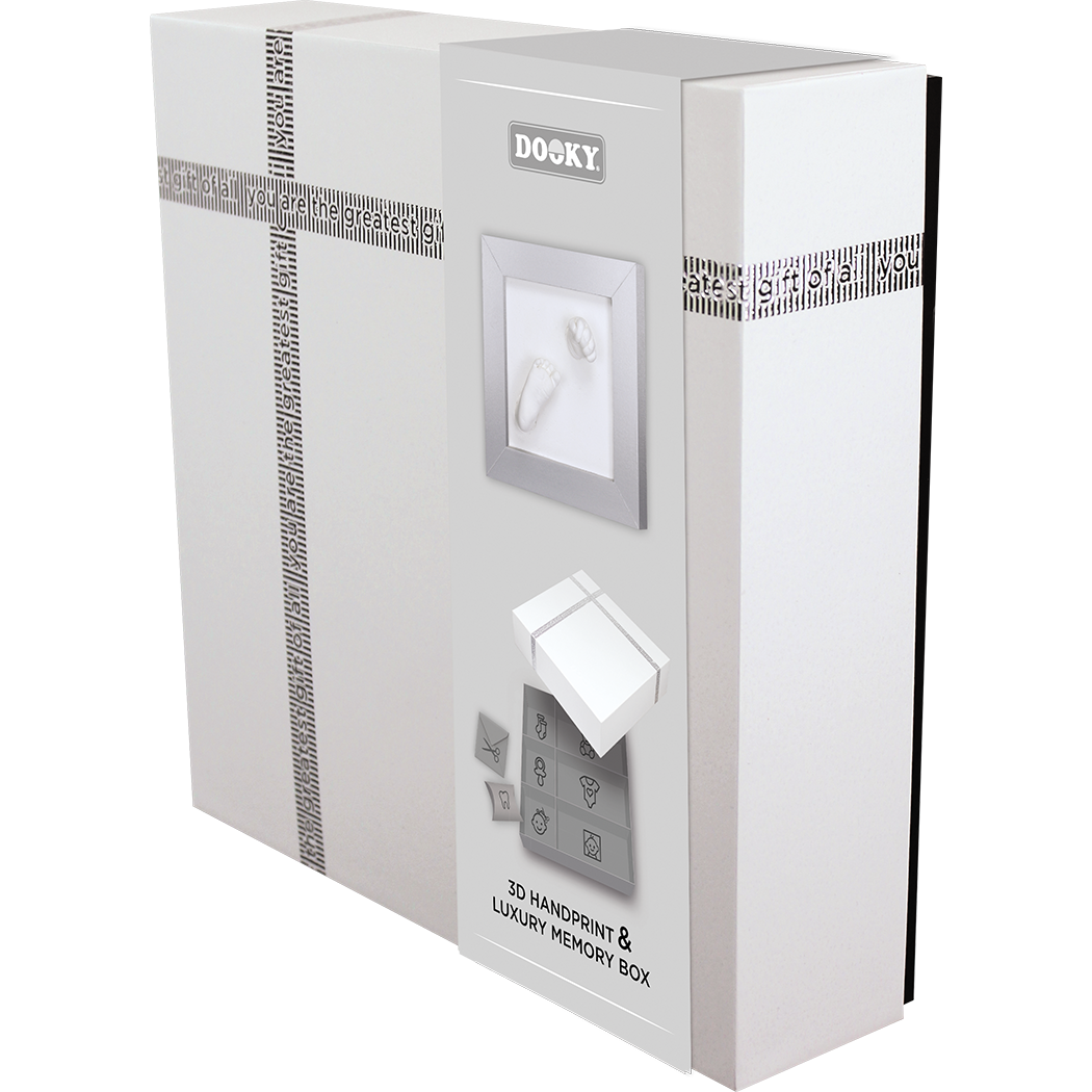 Dooky 3D kipsikehys ja muistolaatikko pakkaus sisältää hopeisen sävyisen kehyksen, jonka sisälle saa kipsivalun lapsen kädestä ja jalasta. Pakkauksen mukana on myös laatikko vauvamuistoille sekä kipsilevy, jonka avulla voi tehdä kipsivalun. Pakkauksen avulla voit luoda ainutlaatuisen ja alkuperäisen muistoesineen itsellesi, lapsellesi tai jollekin erityiselle.